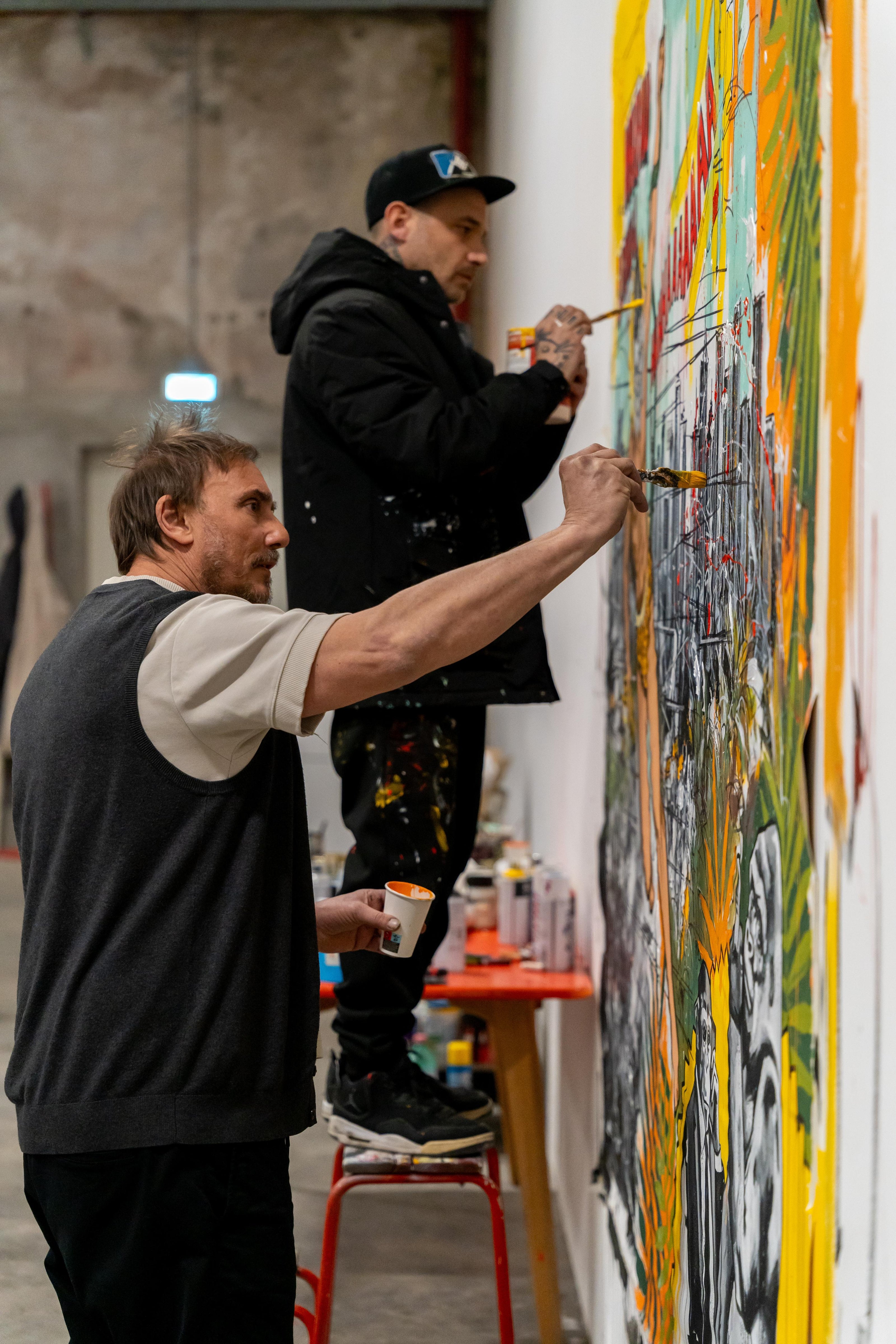 Marco Tamburro e Daniele Oldani, accomunati dalla necessità di esprimersi attraverso l’arte, pur con approcci stilistici molto diversi, sono riusciti a far convivere due stili pittorici antitetici con armonia e fluidità. Da un lato, le pennellate intense e rapide di Tamburro, che esplorano le inquietudini e il disincanto dell'essere umano che vive nelle metropoli; dall’altro, l’immaginario pop di Oldani, ricco di ironia sociale. La fusione tra Roma e Milano ha dato vita a opere d'arte che riflettono pienamente la visione dei due artisti.