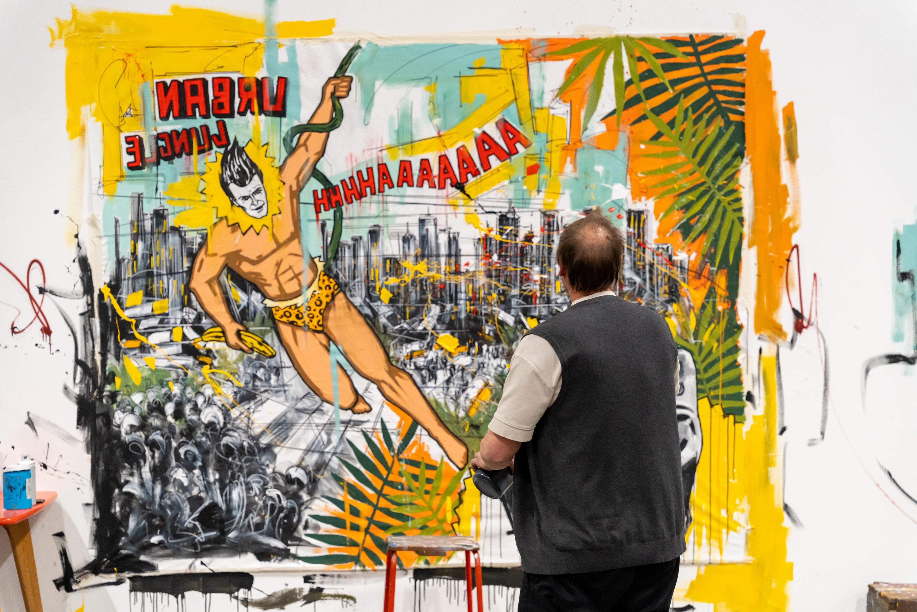 L'opera eseguita live, "Urban Jungle", incarna perfettamente la fusione dei due stili pittorici di Marco Tamburro e Daniele Oldani. Al centro della composizione troviamo un Tarzan contemporaneo che si muove tra liane urbane, simbolo di una giungla metropolitana. Questo nuovo Tarzan, che vive e si adatta alle città moderne, è rappresentato nello stile fumettistico e ironico tipico di Oldani, mentre il paesaggio urbano che lo circonda è reso attraverso il linguaggio pittorico iconico di Tamburro. L’opera riesce così a unire due visioni artistiche apparentemente contrastanti in una sintesi davvero armoniosa.