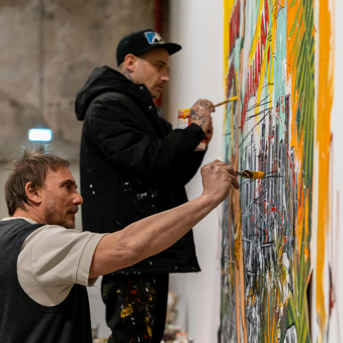 Marco Tamburro e Daniele Oldani, accomunati dalla necessità di esprimersi attraverso l’arte, pur con approcci stilistici molto diversi, sono riusciti a far convivere due stili pittorici antitetici con armonia e fluidità. Da un lato, le pennellate intense e rapide di Tamburro, che esplorano le inquietudini e il disincanto dell'essere umano che vive nelle metropoli; dall’altro, l’immaginario pop di Oldani, ricco di ironia sociale. La fusione tra Roma e Milano ha dato vita a opere d'arte che riflettono pienamente la visione dei due artisti.