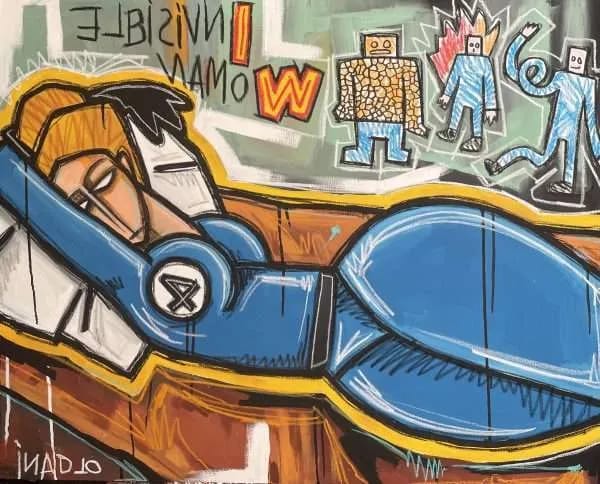Daniele Oldani reinterprets Amedeo Modigliani's work "Reclining Nude" in a contemporary and original key. In his work, Modigliani's sensual and relaxed female figure is replaced by Invisible Woman, the Invisible Woman of the Fantastic Four.