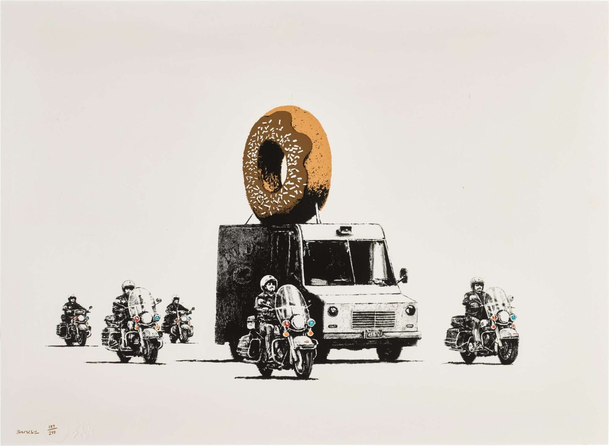 The scene in the play depicts a squad of policemen on motorbikes escorting a cargo truck with a huge chocolate donut on top. It can be deduced that the artist wanted to give even more prominence to the donut by giving it color. The meaning of Donuts Chocolate is to create a satire towards the policemen who protect with the utmost sacredness what is dearest to them.