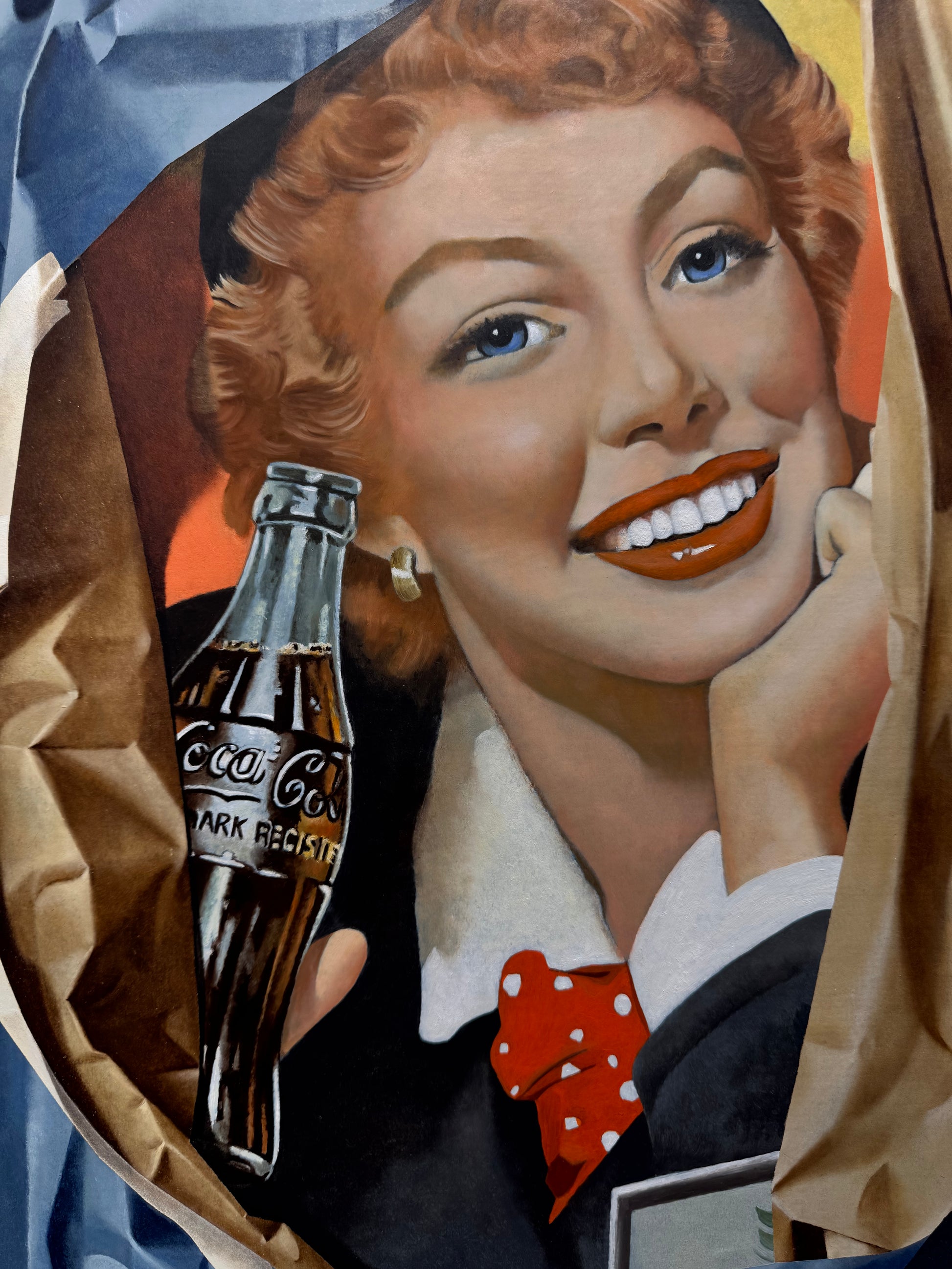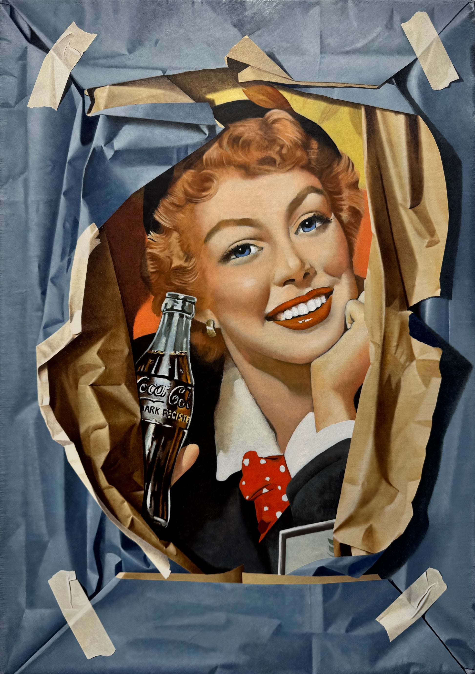 Fabio Inverni dipinge gli imballaggi con tecnica Iperrealista. Il panneggio della carta piegata conferisce alla tela una tridimensionalità spiccata.