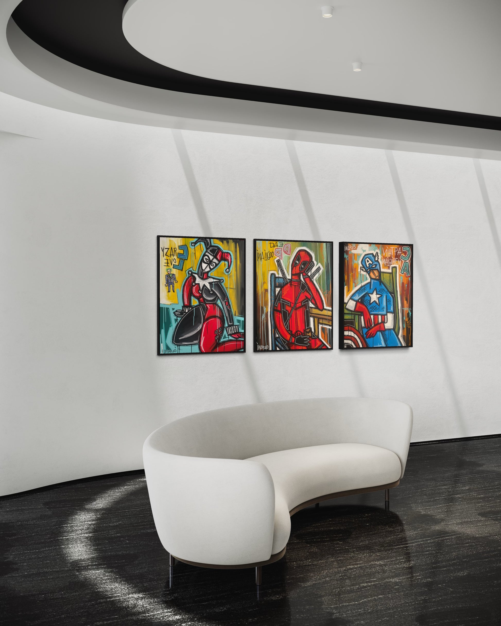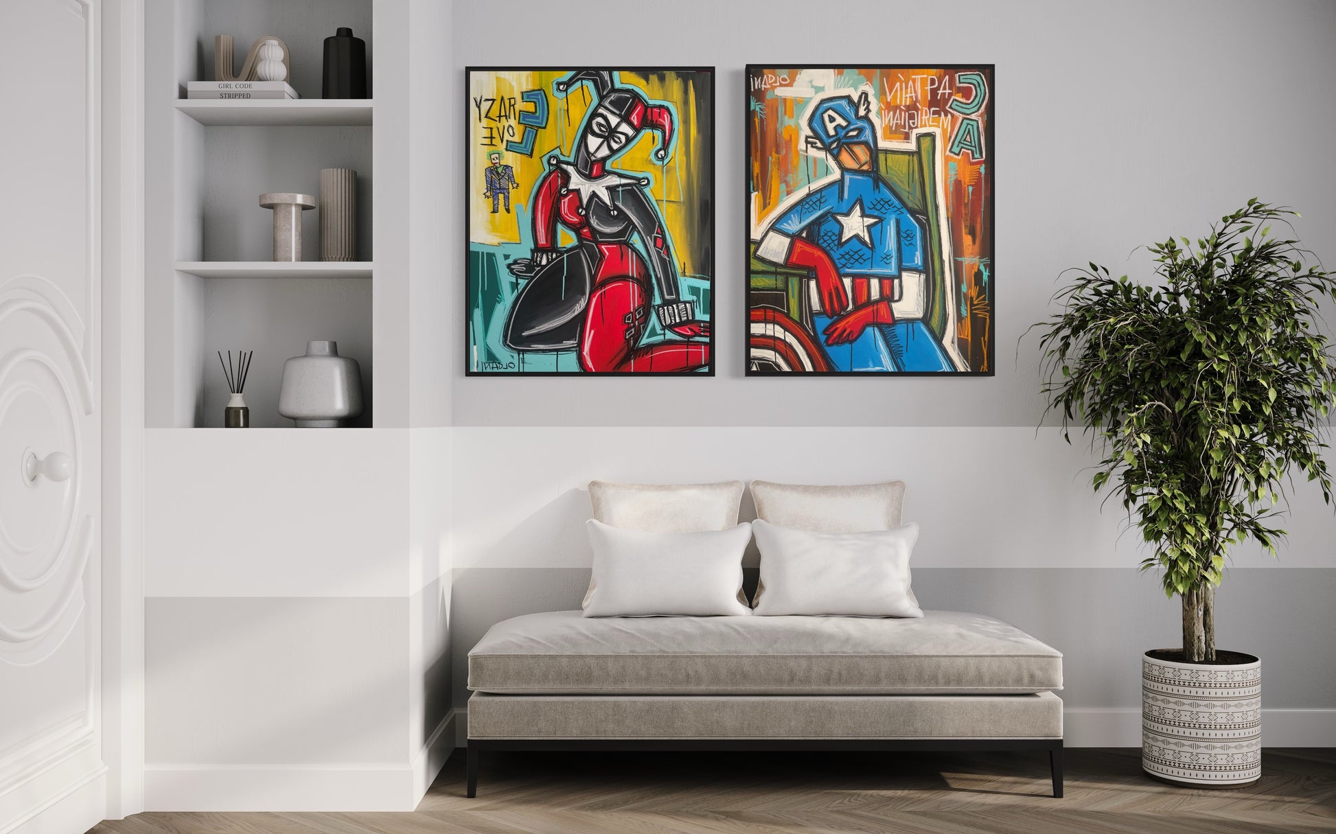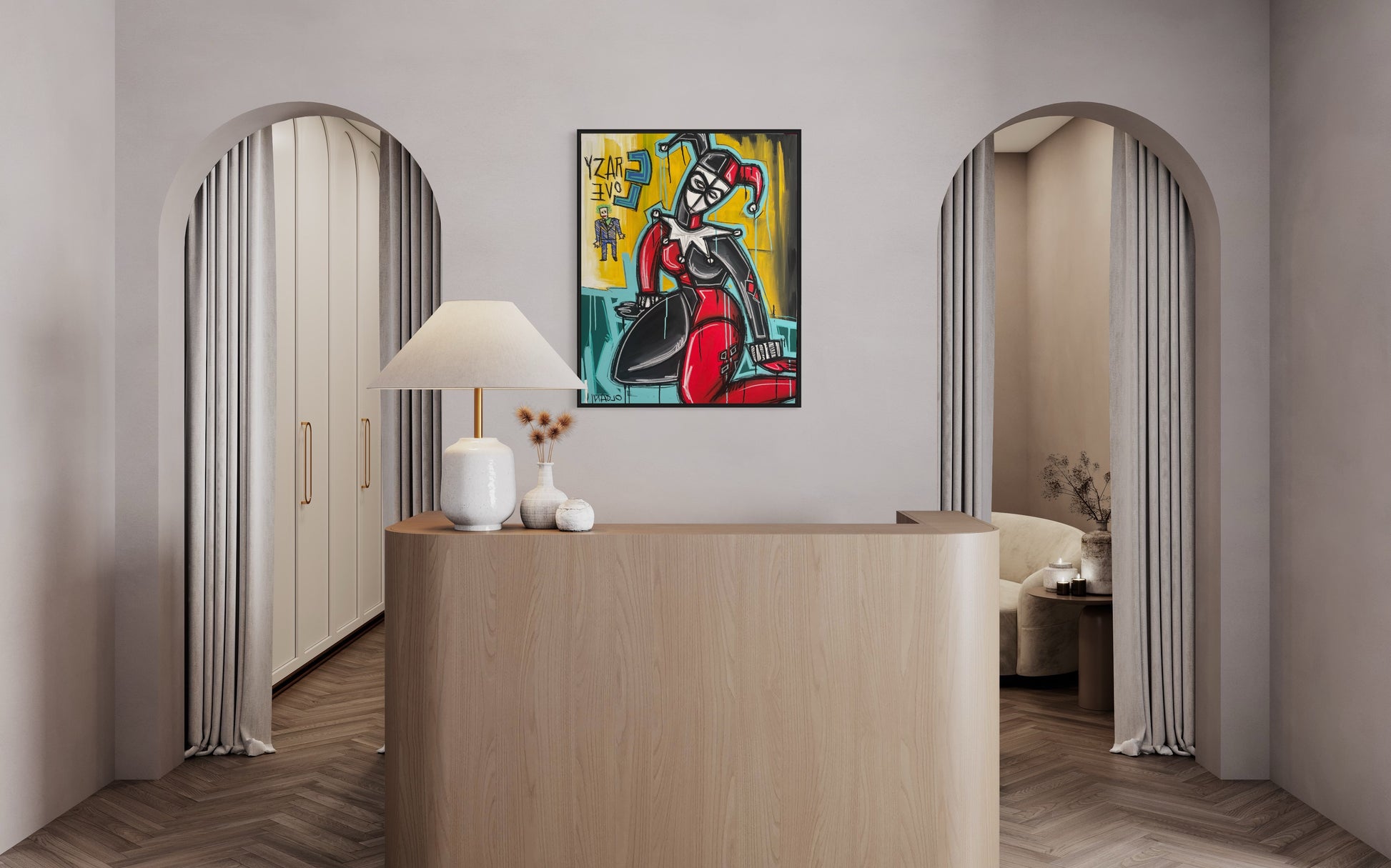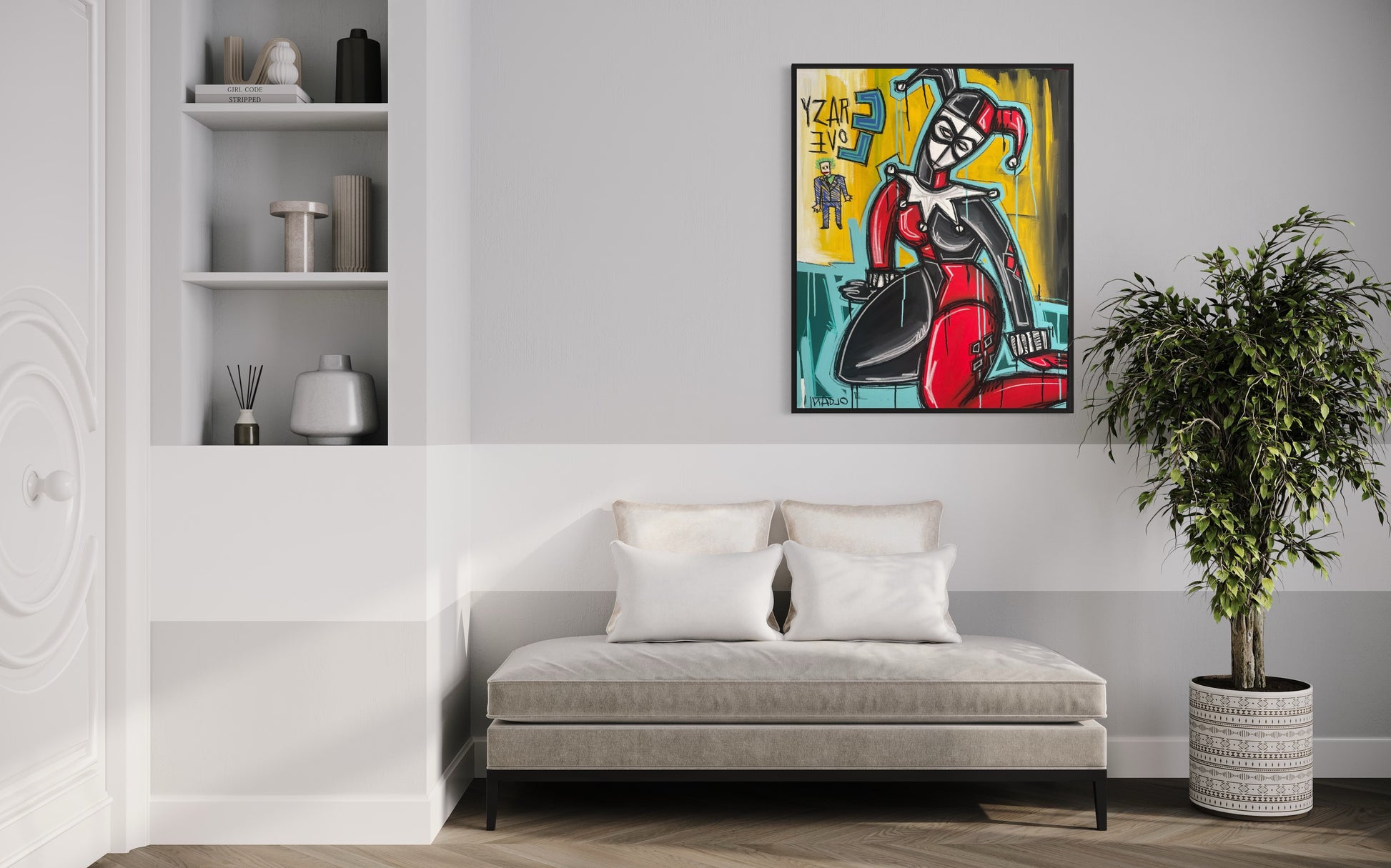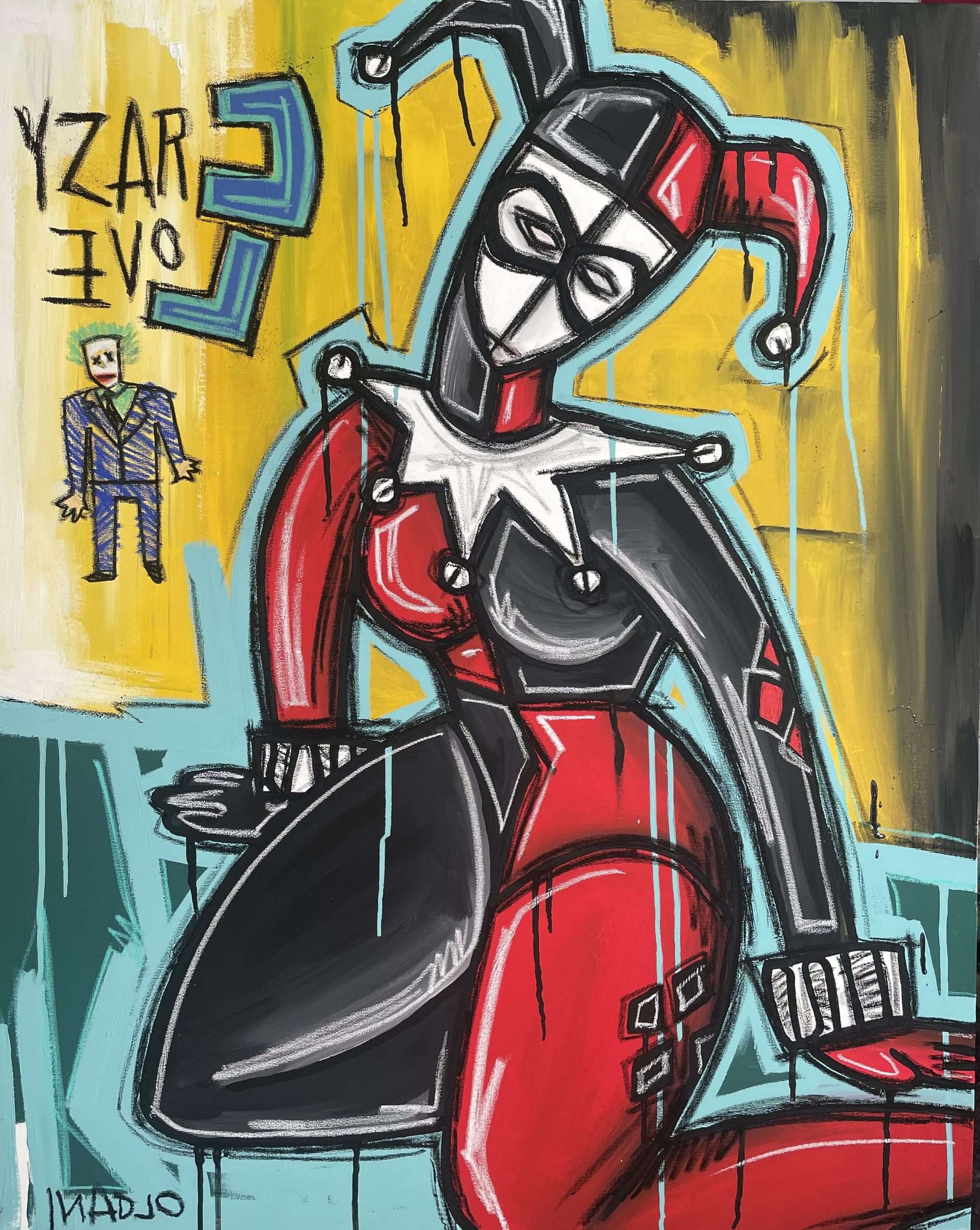 “Crazy Love” is an artistic creation that portrays “Harley Quinn”, a character who appears in the Batman animated series, famous for having fallen in love with the infamous Joker who we can see portrayed in the background of the canvas; The batman's sworn enemy wears a purple tuxedo with a matching green shirt with disheveled hair and has his typical white makeup and the inevitable lipstick that hides his cut lips. Harley Quinn, the protagonist of the work, is portrayed with her extravagant red and black jester costume completed by the so-called "fool's hat" made up of two tips with bells placed at the ends of each tip. He wears a five-pronged collar, also with bells hanging from it. Oldani paints the psychiatrist Harley Quinn sitting on the floor with her knees and hands resting on the floor whose color is characterized by light blue and sugar paper tones. Harley Quinn seems to be looking at us with her head askance. The pupilless eyes are a tribute to Modigliani, as is the physiognomy of the jester's body.