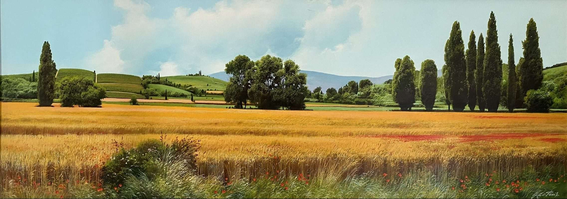 Francesco de Panis (Genoa 1949) is a poetic and refined artist who, with his vivid and masterfully executed oils on panel, recounts the beauty of the Tuscan countryside. Always faithful to the figurative, now back in vogue after years in which it seemed to have been forgotten, he takes us for a walk along paths protected by rows of cypresses, hills made blonde by expanses of wheat and splendid farmhouses that immediately make us think of lazy afternoons spent sipping Chianti and listening to the voice of nature. His paintings manage to be extremely realistic - you really have the feeling of being in Tuscany and, at the same time, imbued with lyricism and impressionist magic. Not for nothing, after the Academy of Fine Arts, he moved to Paris, reviving the splendid tradition of the "les italiens de Paris" those artists such as De Chirico, Massimo Campigli, De Pisis who, in the 1930s, left the Italy in search of fortune. In Paris, Francesco De Panis meets PM Laurent, heir to the great French impressionist tradition. He worked with him for two years and was inevitably influenced by him. Returning to Italy, he dedicated himself to the study of simultaneous contrasts and complementary colors, soon arriving at a technique capable of combining precision, fluidity, brightness, compositional balance and transparency. Francesco De Panis has been the protagonist of prestigious solo exhibitions in Italy, Germany, Spain, Switzerland, the United States and Venezuela as well as the winner of authoritative awards. His works enrich important collections in Italy and abroad