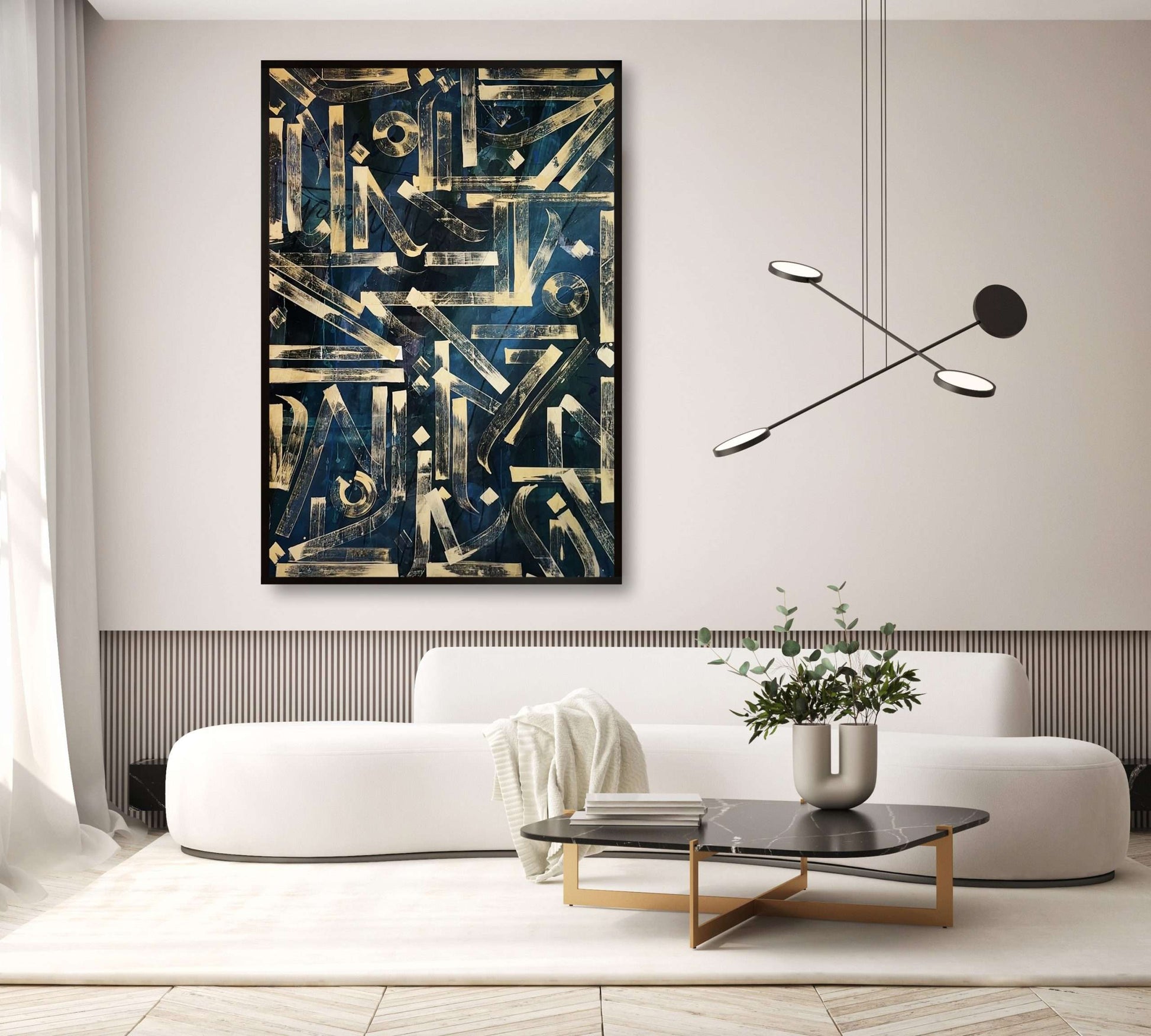 Kate Paul, in the series of works “Calligraphy”, explores various forms of linguistic systems with originality. The artist, originally from Poland, creates canvases with ancestral writing systems, where signs of the past are connected with the present. An artistic research, carried out through the experimentation of graphemes: the painter, in fact, declares that she has studied old documents and ancient writings present in various ruins. The work on canvas, "Gold Ocean", with a background that fades from navy blue to dark slate grey, which recalls a dark sea that reflects the darkness of the sky, is illuminated by the unmistakable linguistic signs of a remote age that characterize the pictorial style by Kate Paul.