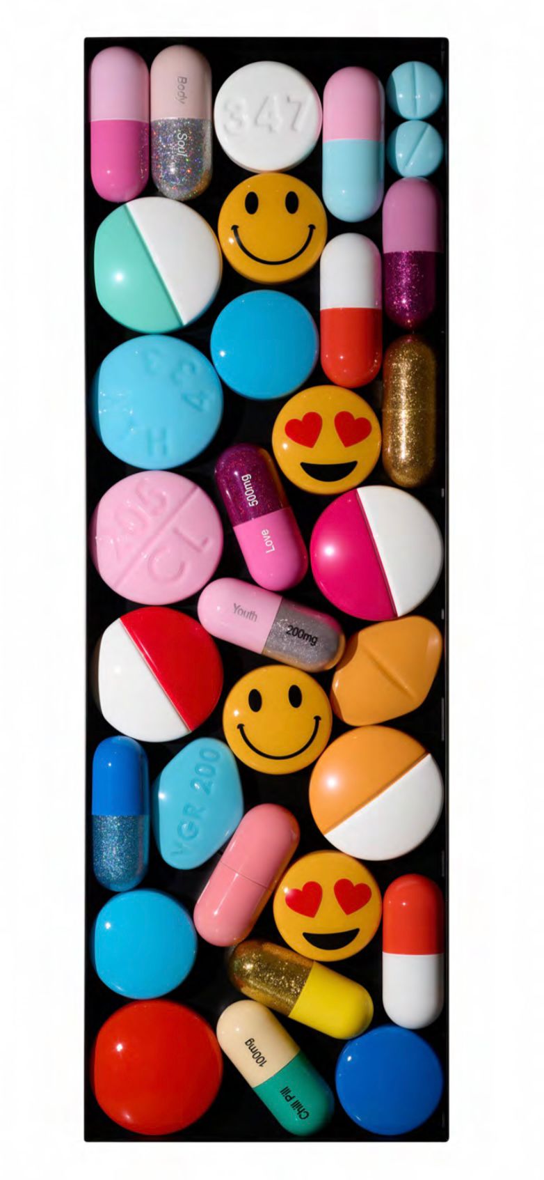 Le opere di Coady sono pillole tridimensionali incastonate e incorniciate. Queste capsule, lucide, glitterate, seducenti come caramelle, sono l’incarnazione plastica di un tema centrale nella cultura contemporanea: il fragile equilibrio tra cura e illusione, tra bisogno autentico e dipendenza emotiva.