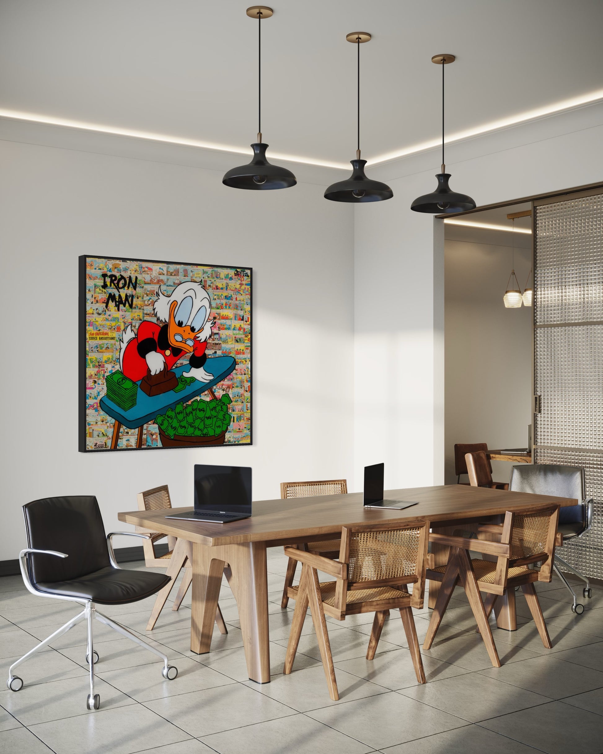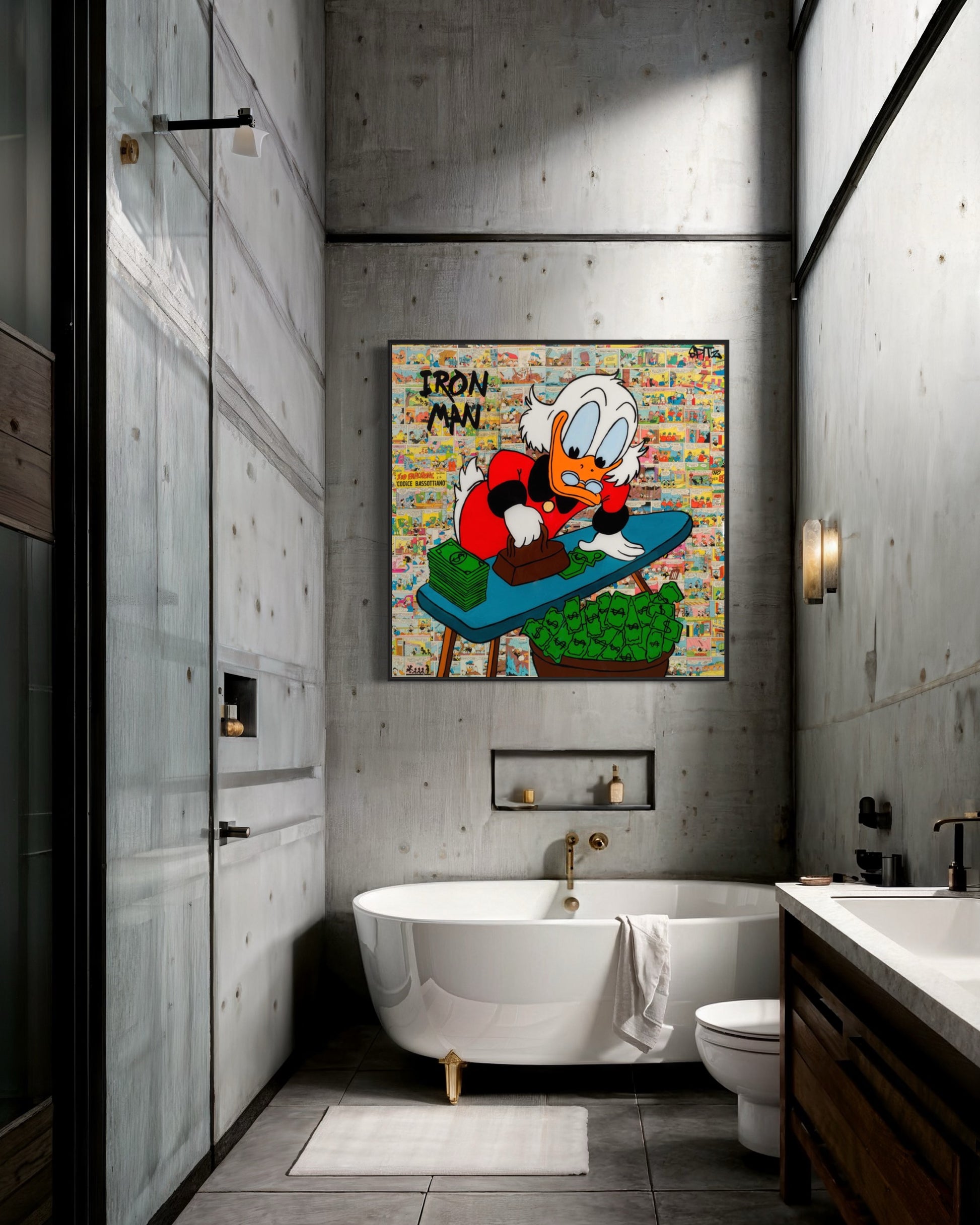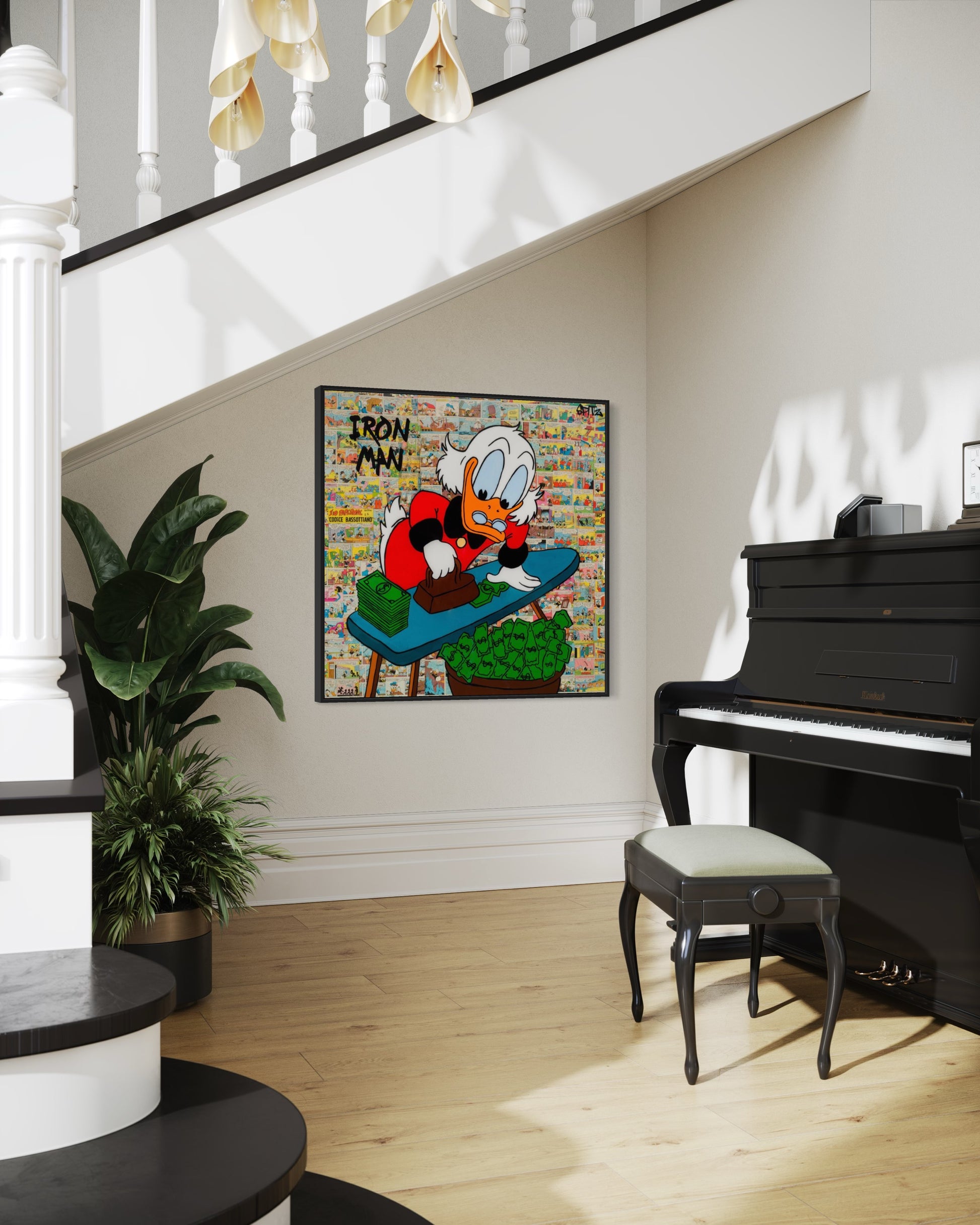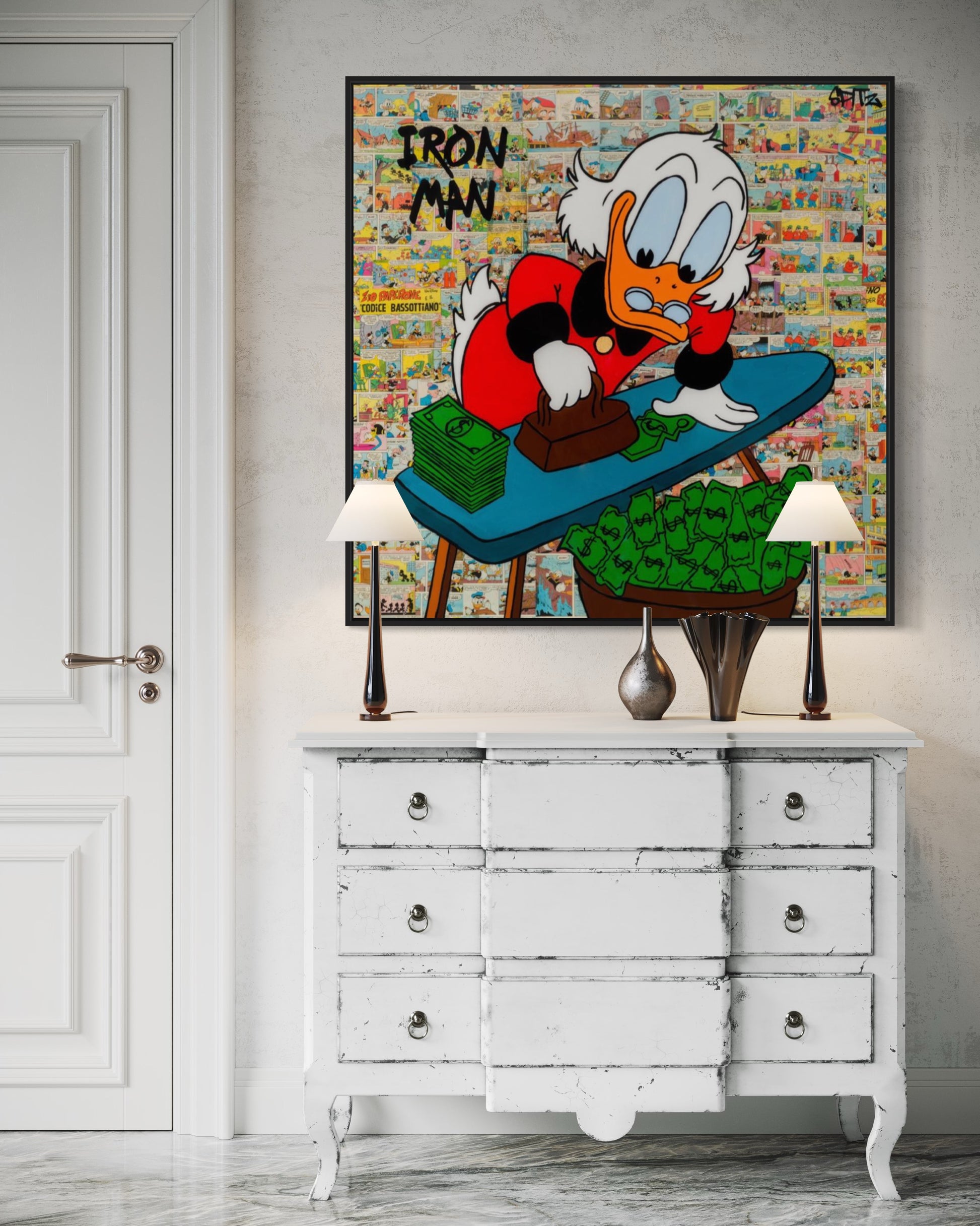 Al centro dell'opera si erge Paperon Paperoni, l'iconico personaggio della Walt Disney, ritratto mentre stira dei dollari. La scelta di raffigurare Paperone in questa posa, concentrato sul denaro, offre un commento satirico sulla sua natura avida e ricca, oltre che sulla cultura del consumismo