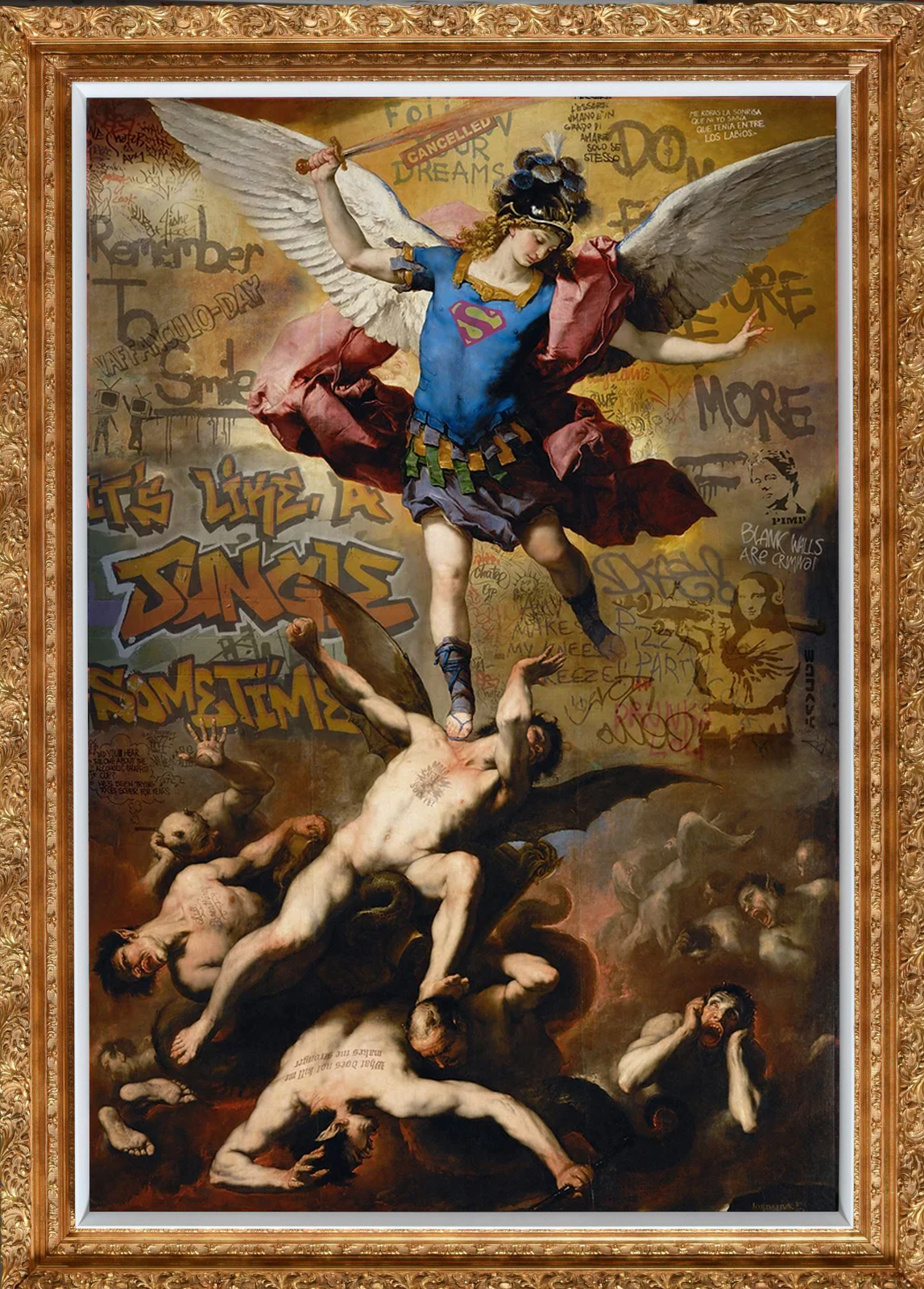 Marco Battaglini, with his ArtPopClassic, sweeps away all space-time logic, fusing past and present to defeat prejudices, mental patterns and free the human race. The colourful, vibrant and vital works of Marco Battaglini are like a good-naturedly mischievous time machine that enjoys shaking, in a cheerful controlled chaos, characters, environments and icons from different eras. His art is a journey, from the front row, through the history of art where ingenious space-time subversions create a pleasant, and very surrealist, surprise effect. It may happen that you observe a Renaissance painter in his sumptuous atelier who, in period clothes, is painting nothing less than... a painting by Roy Lichtenstein. Or a Marylin by Andy Warhol. Marco Battaglini addresses our society, asking and advising us to observe the world, or rather the worlds, from a different perspective using art as a tool to dismantle prejudices, preconceptions and live in perennial creative freedom. Words? No, facts. He was the first, after his academic training in Italy, where he masterfully learned the history of art and the ability to reproduce the great masters, he moved to Costa Rica. In search of the sun, Caribbean colors and new points of sight, discovering that all it takes is taking a plane to arrive at a completely different mindset. Thus was born ArtPopClassic, a real movement where art takes on the difficult task of overthrowing pre-packaged ideas and prejudices in the name of renewed freedom. As? Playing with opposites. Young Ephebians, with sculptural physiques, are captivated by the paintings of Titian, Guido Reni and many other masters. Thrown from the domes of the chapels to our suburbs, covered in tattoos like footballers, tronistas and influencers. They wear very tight Calvin Klein briefs while their tapered fingers no longer point to the sky, but to walls smeared with graphite while clutching lollipops. The public finds itself in a virtual stadium where the most important match is played: the one between the large antithetical categories. Present and past, elegance and vulgarity, wealth and poverty, aesthetics and anti-aesthetics. All amplified by writings that seem copied and pasted from the walls of a station bathroom or from the school diary of a rebellious and pacifist teenager: Make love not war, Gentleman prefer Blondes. There is no shortage of references to the world of music, publishing and cartoons in a delicious cross-media mix and match. A declared surrealist, this Italian-Costa Rican fusion artist looks to Duchamp: ideas generate other ideas, creating new ways of seeing things and, consequently, new worlds. Let's not be fooled, though. The irony and inevitable fun hide a severe criticism of society. Battaglini reproaches humanity for being inconsistent, for living along non-communicating parallel lines, solitary prime numbers clinging to their own beliefs. In these individual microworlds people are constantly under attack. The enemy is the disproportionate amount of information, too much to be processed and understood. It is at this point that art intervenes. Battaglini's works do not claim to provide answers or solutions. Rather, they question, instill doubts and invite reflection. The amused shock of the space-time pastiche generates questions. Question after question, the public understands that prejudice, stereotypes and fixed beliefs change quickly from generation to generation. They change as soon as you get on a plane headed for distant countries. They are a prison built with sand from which it takes very little to escape. It is no longer beauty that saves the world, but art. And never mind if, in the fight against infernal demons, the archangel Gabriel wears the Superman t-shirt. He has the body, he can afford it.