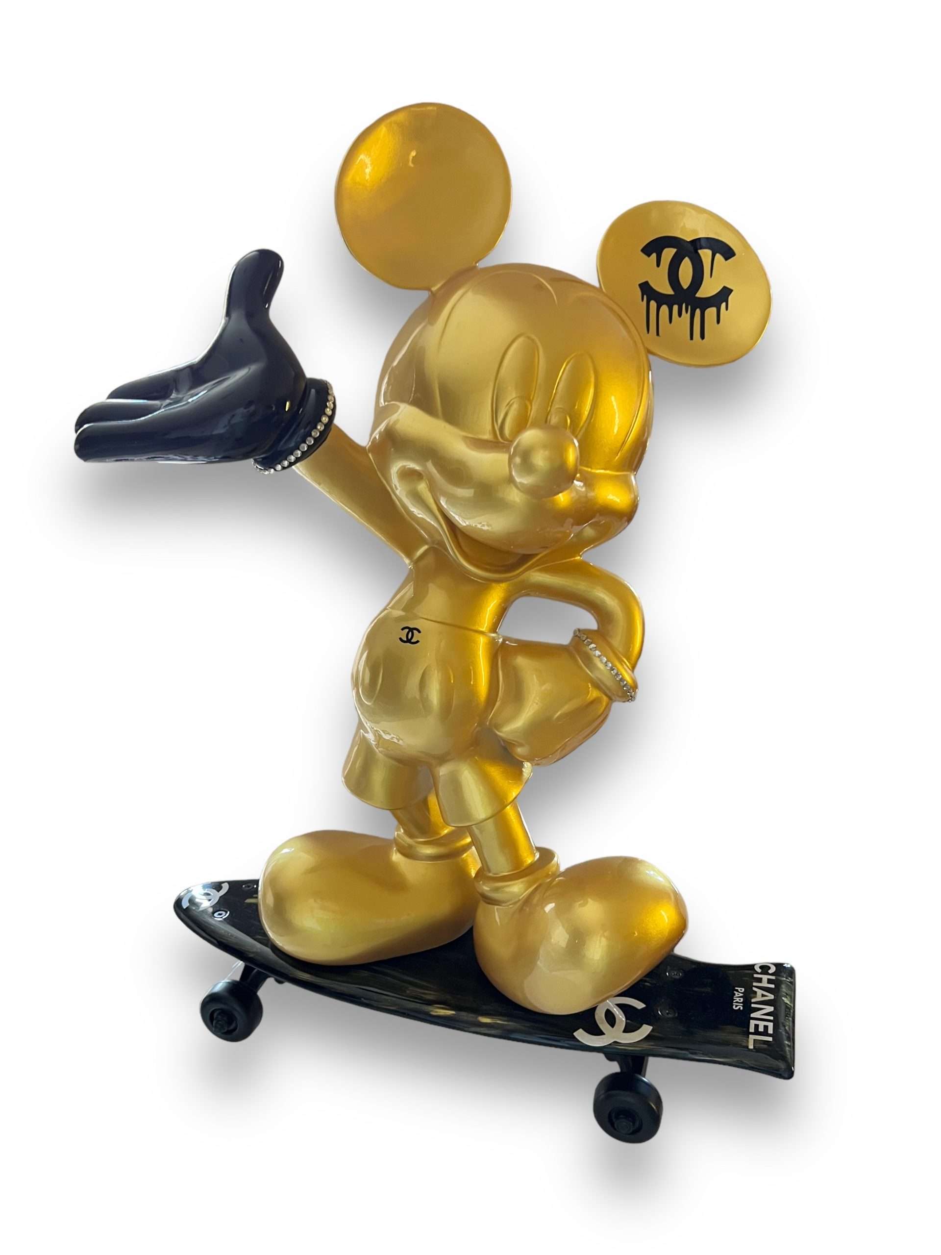 Jonathan Griffith in the resin sculpture "Mickey Gold On Skate", portrays the very popular protagonist of the comic created by Walt Disney on top of a black Chanel-branded skateboard, in one of his iconic positions. In this work, the Grosseto-born artist depicts Mickey Mouse using a gold tone and tattooing the symbol of the brand created by the famous designer Coco Chanel on both his ear and his belly. Mickey Mouse wears a black glove in his right hand. Additionally, both wrists wear a bracelet that appears to be made of diamonds. The cute little mouse becomes an object that could easily be inside a Luxury Store window: Mickey Mouse, protagonist of the imagination of world popular culture, is transformed, with an operation typical of Pop Art, into a work of art.