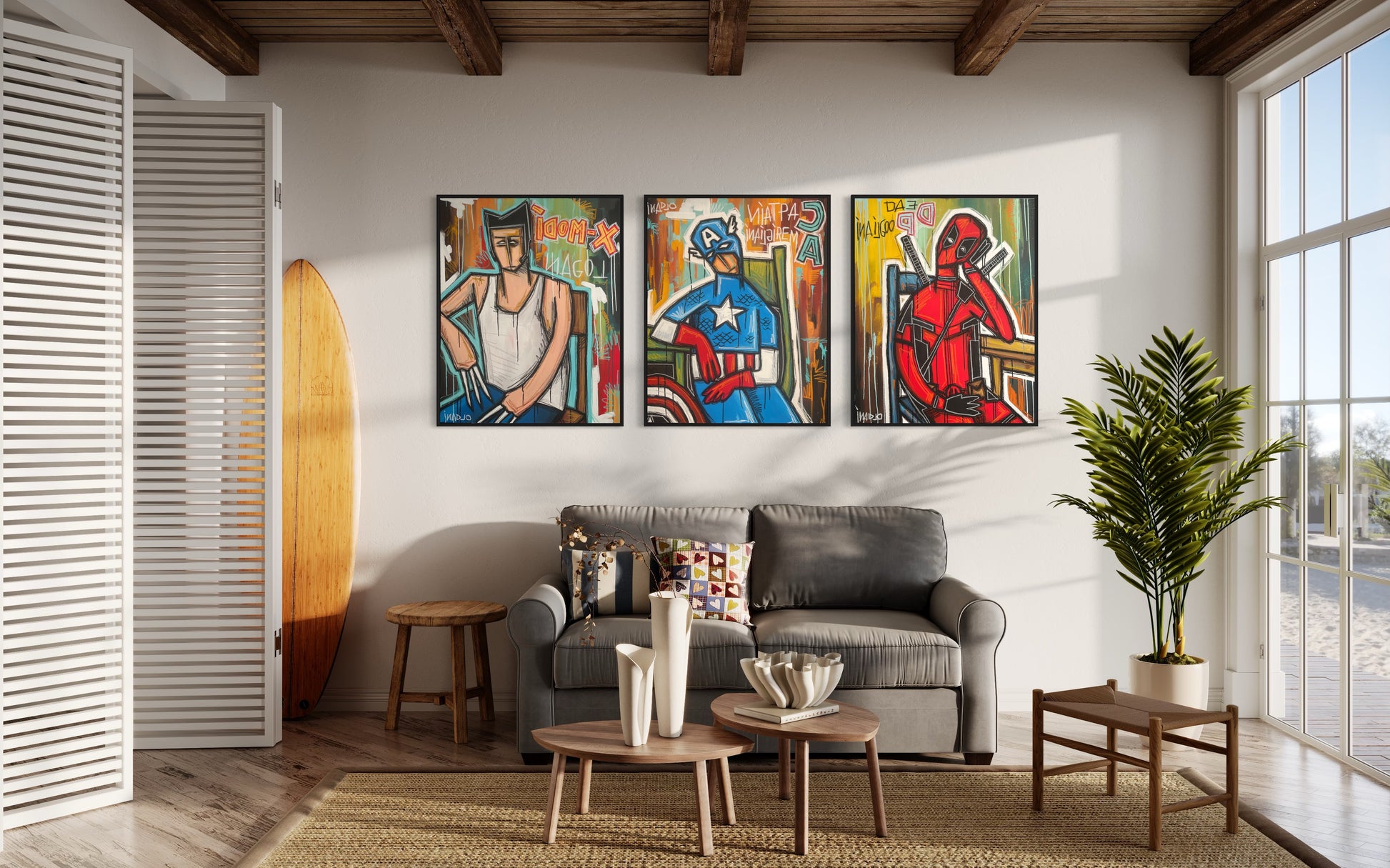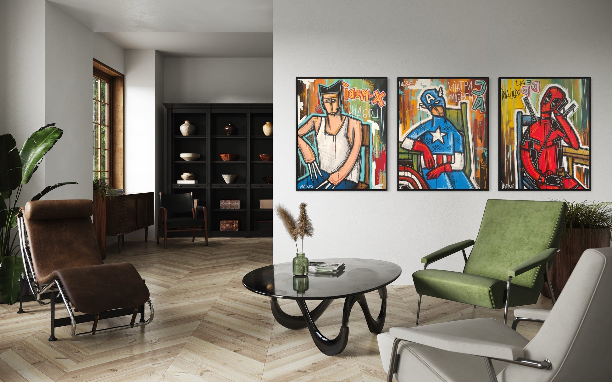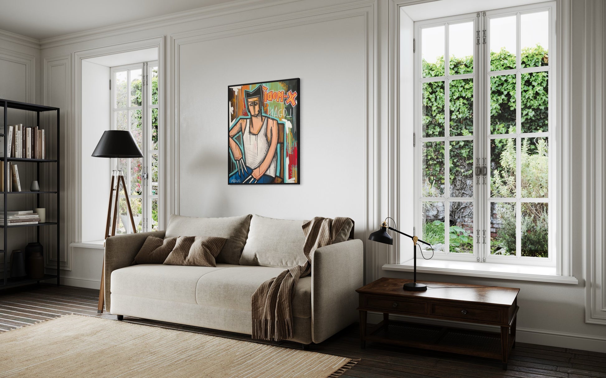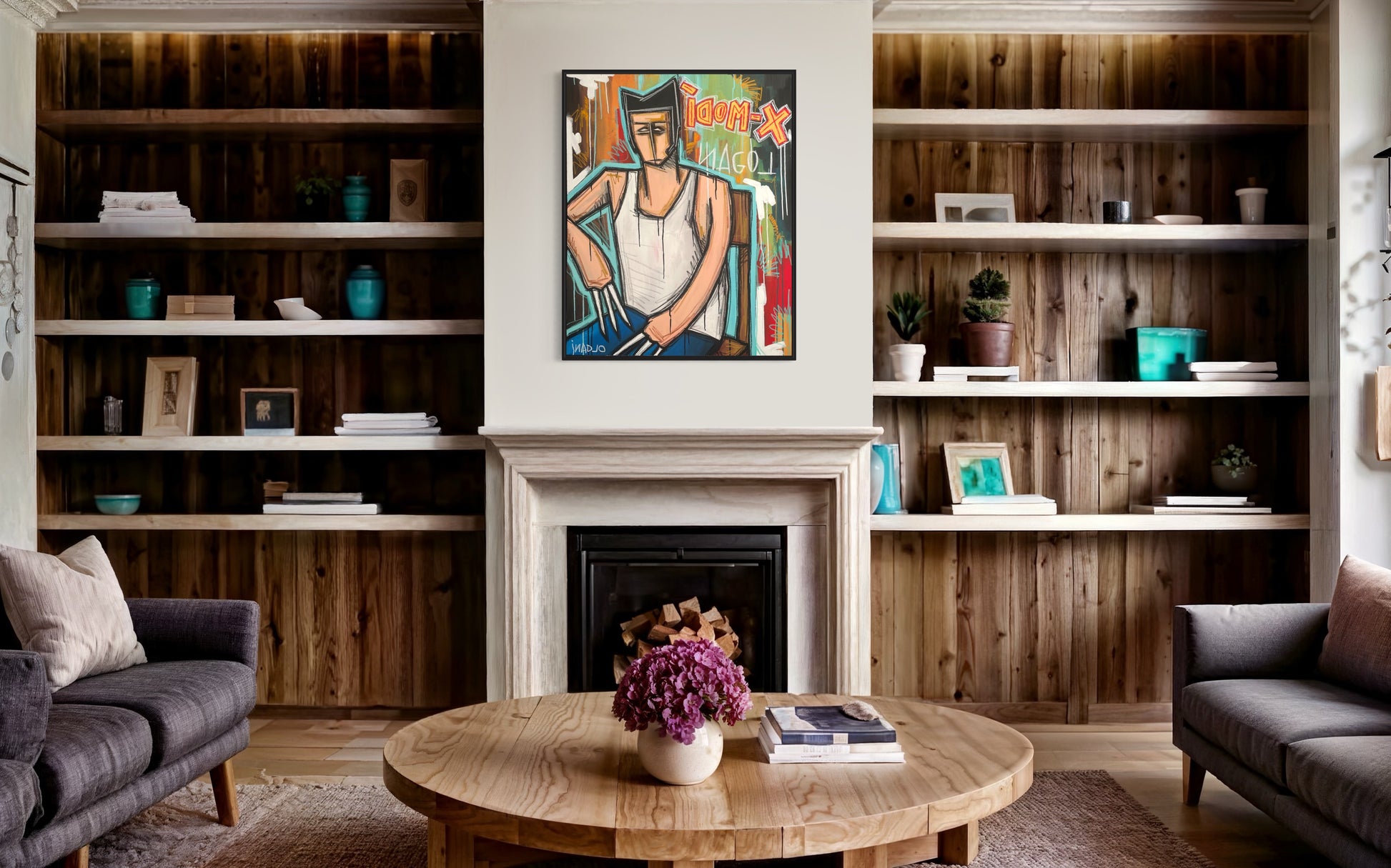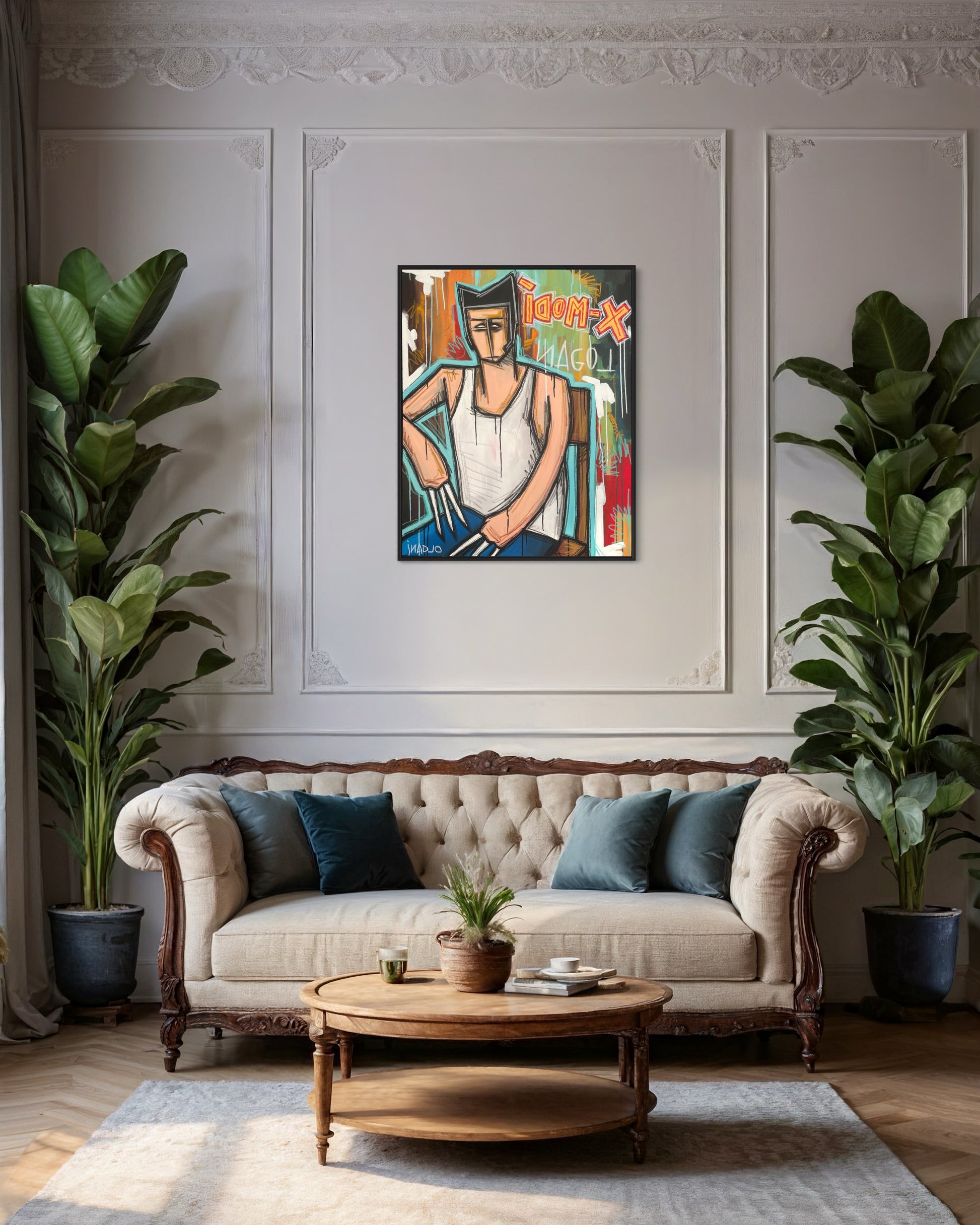 Oldani's Logan is portrayed in his characteristic look consisting of: white tank top, blue jeans, unkempt beard and hairstyle with the long sideburns that distinguish the mutant. The adamantium claws are inevitable, lethal weapons used by Wolverine. The protagonist of the work is portrayed sitting on a wooden chair and has his left elbow resting on a table with his arm dangling downwards. This work also transforms the comic book characters through Modigliani's peculiar style, reinterpreted with profound wisdom by Daniele Oldani who celebrates the avant-garde of Livorno origins by citing in his work the poetic aesthetics of elongated bodies and soulless gazes.