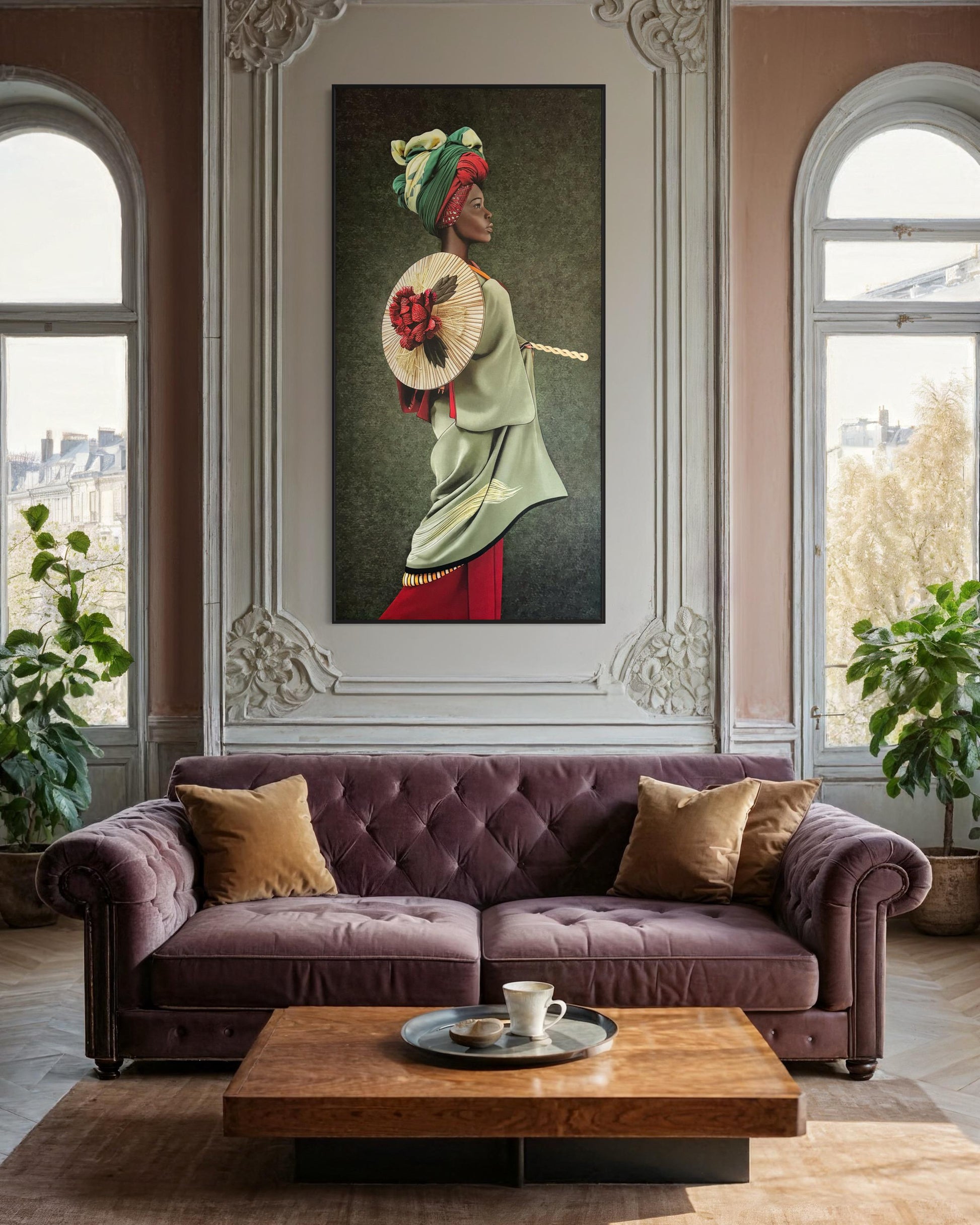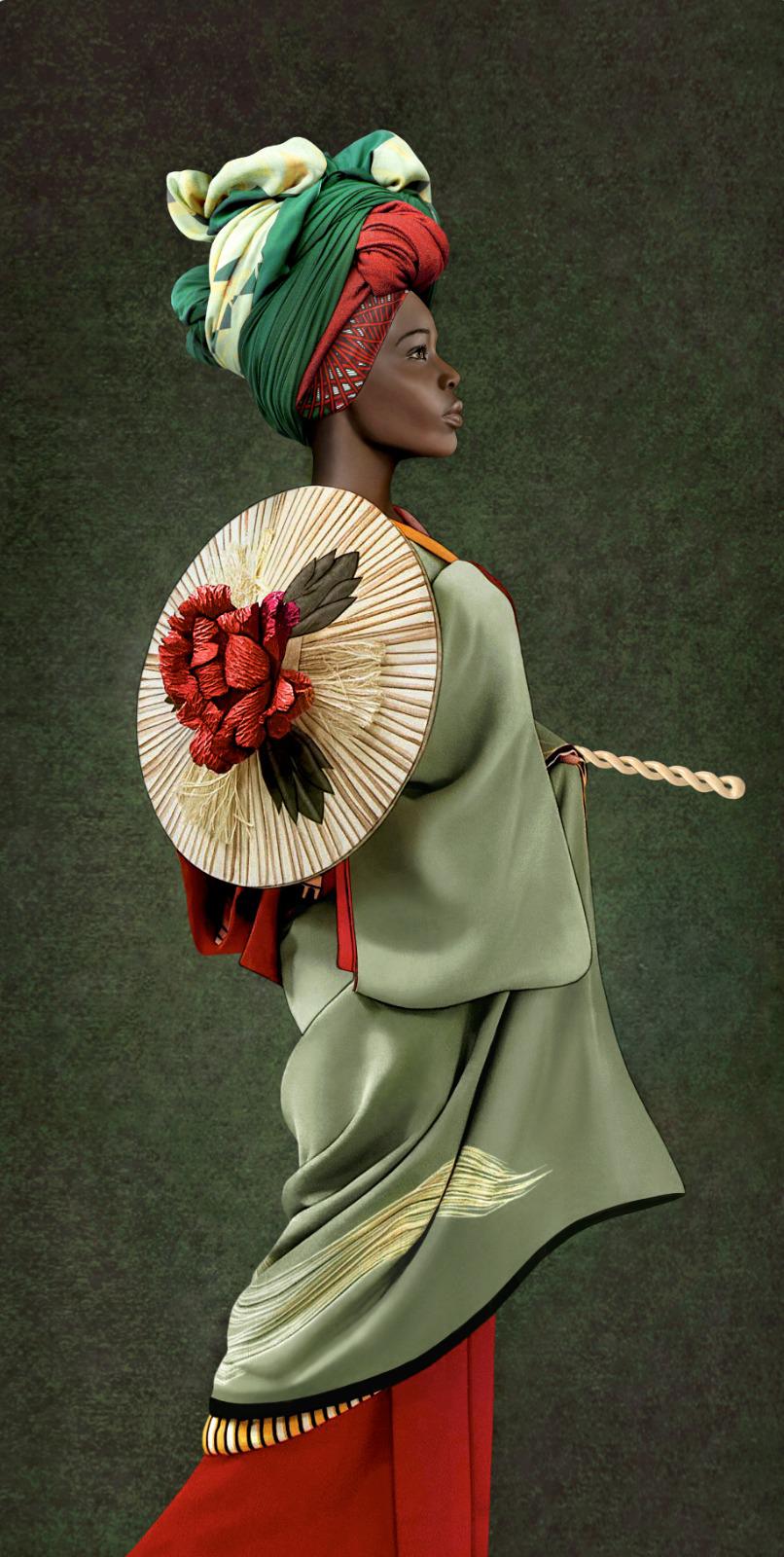 This work of art celebrates the union of African culture with Japanese culture. The artwork by Gian Paolo Tomasi represents a Kenyan girl dressed as an "onna-bugeisha", the warrior woman belonging to the Japanese nobility.