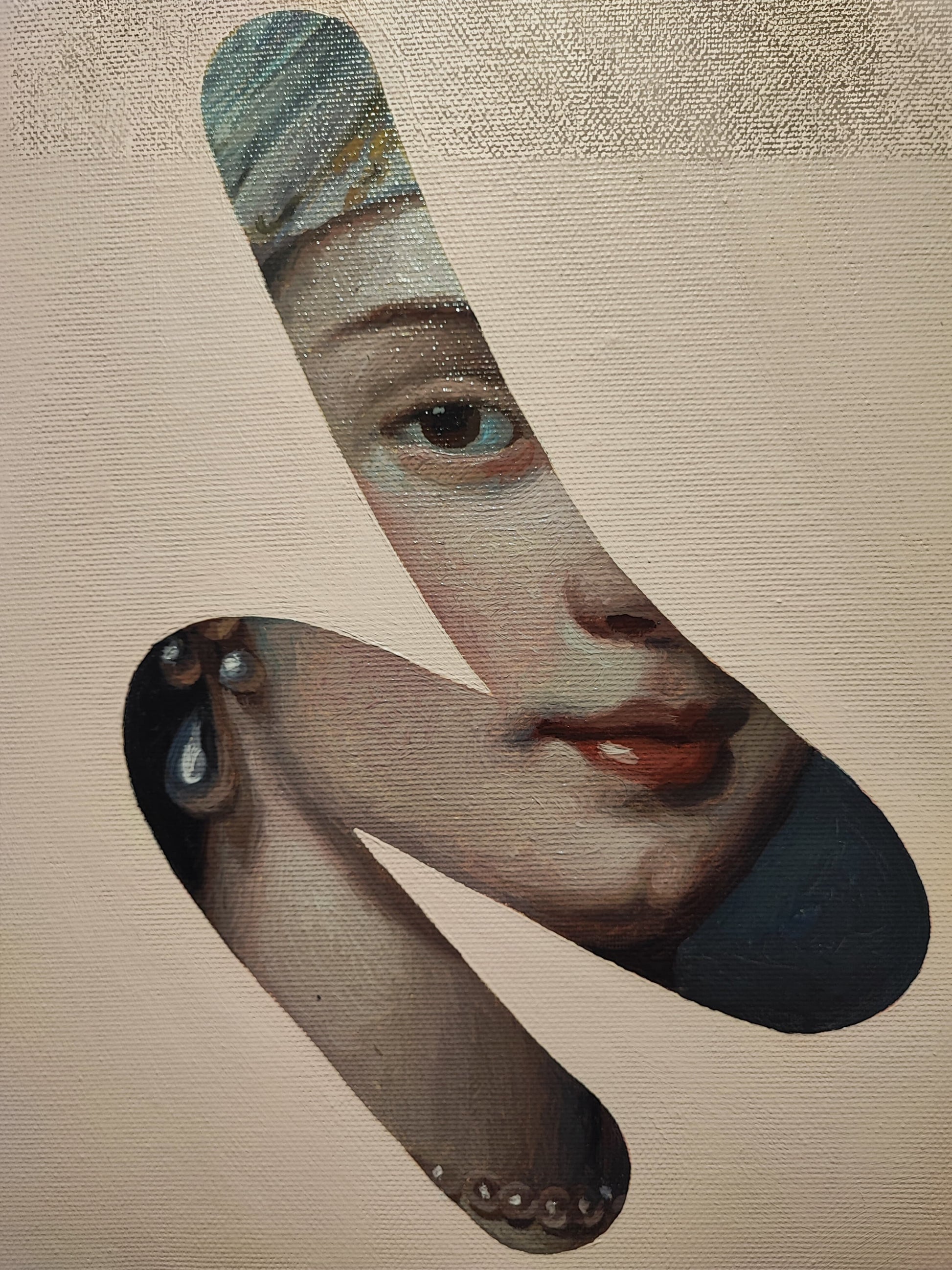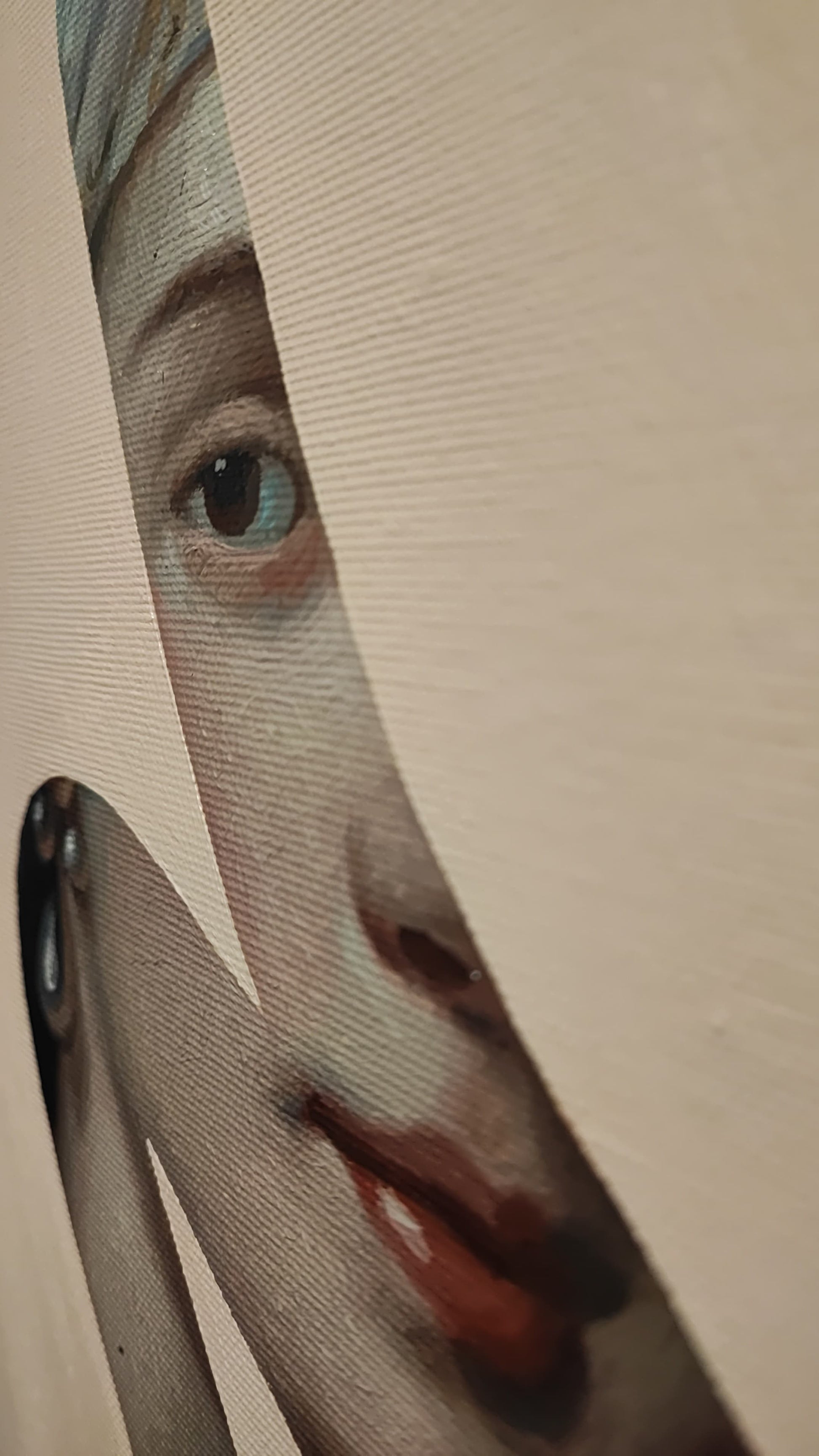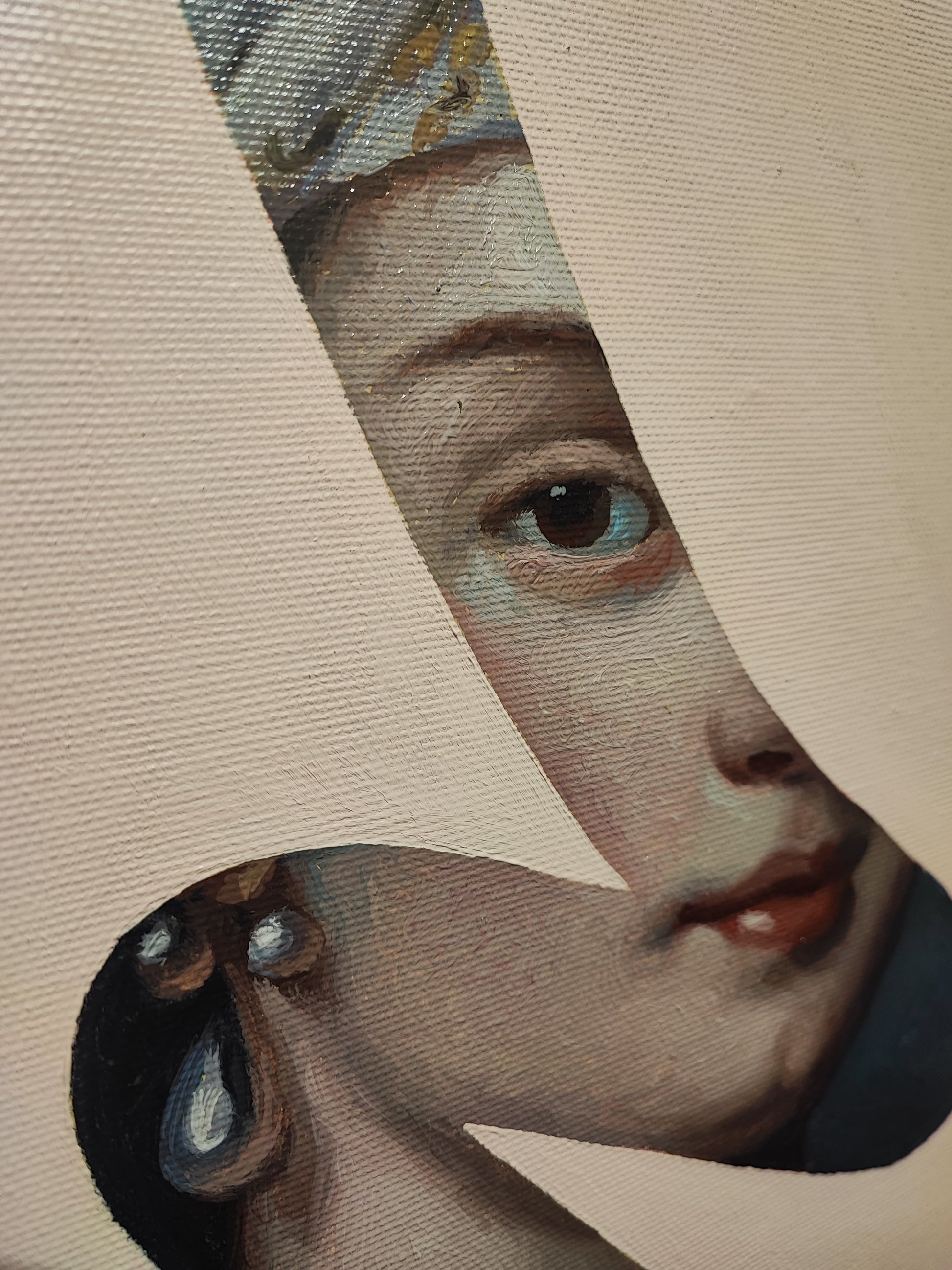 The canvas painted by Lago reproduces the face of the protagonist of the painting "The broken pitcher" created by Bouguereau in 1891. The original work represents a girl who has lost her virginity. Lago zooms in on the girl's face and covers it with a pink hand. The usual crack in the monochrome layer shows the girl's face. Thanks to the slit created by Lago, we glimpse the girl's face. His look communicates something. The peasant's sad expression represents the loss of innocence. Another masterpiece is desecrated by Lago. The Spanish artist creates a work of art with a seemingly illogical meaning. Disorientation is designed to trigger thought in the user. The antithetical union activates our synapses. A reflection on the long and complex debate between figurative art and abstract art is Lago's objective.
