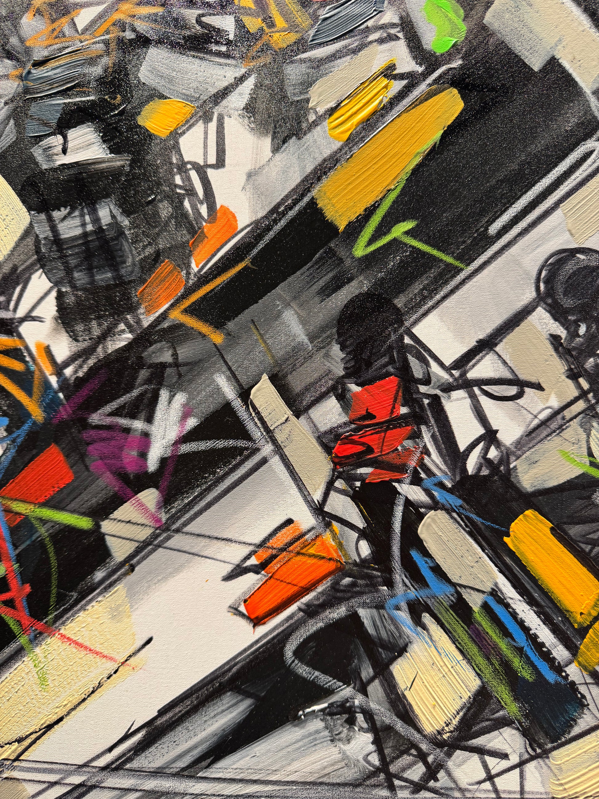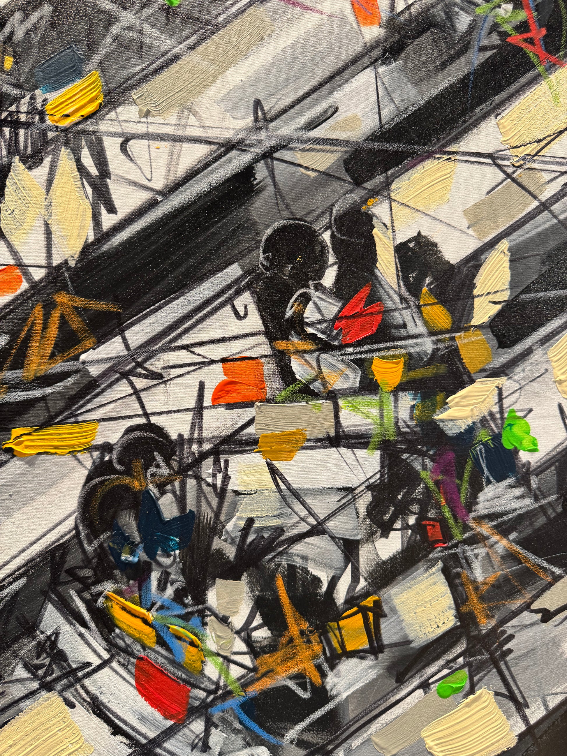 I colpi di colori vivaci stesi dall'artista attenuano l'irrequietezza delle tonalità sfumate di bianco, grigio e antracite, tipiche dell'asfalto. Individui alienati attraversano frettolosamente strisce pedonali, trasportando borse durante una giornata di shopping. In effetti, l'unico svago che la vita metropolitana spesso offre è l'acquisto sfrenato, lo shopping compulsivo. Tuttavia, l'imperativo rimane la fretta: shopping sì, ma veloce. Magari durante la pausa pranzo.