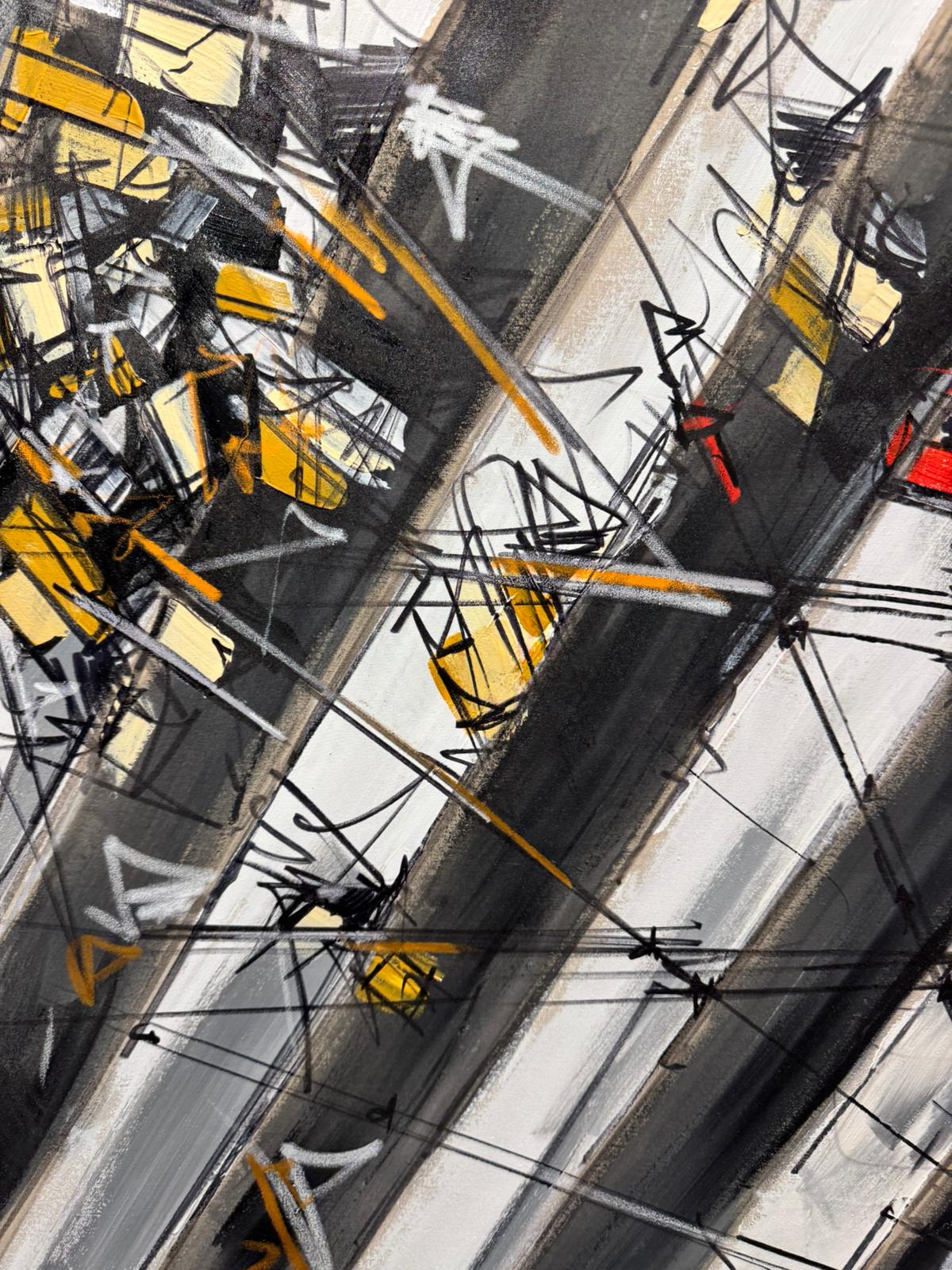 I colpi di colori vivaci stesi dall'artista attenuano l'irrequietezza delle tonalità sfumate di bianco, grigio e antracite, tipiche dell'asfalto. Individui alienati attraversano frettolosamente strisce pedonali, trasportando borse durante una giornata di shopping. In effetti, l'unico svago che la vita metropolitana spesso offre è l'acquisto sfrenato, lo shopping compulsivo. Tuttavia, l'imperativo rimane la fretta: shopping sì, ma veloce. Magari durante la pausa pranzo.