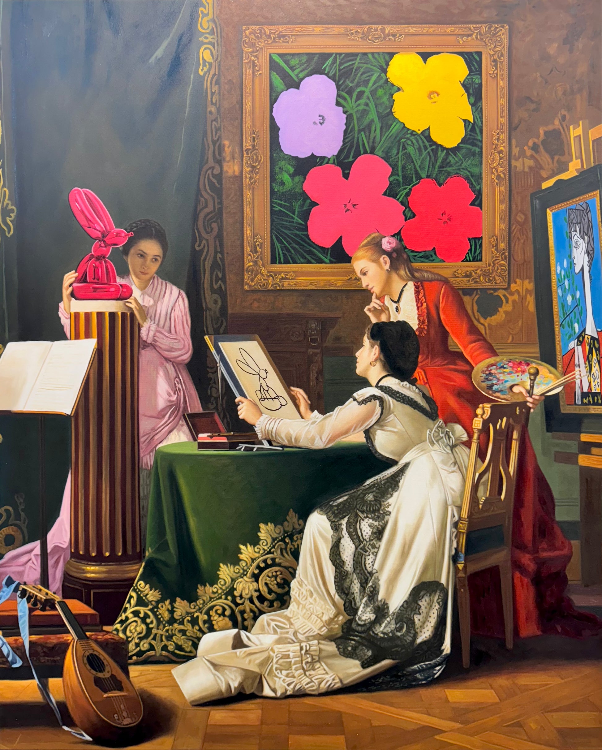 Questo contrasto tra il raffinatissimo abbigliamento delle dame e l'avanguardia artistica di artisti come Warhol o Hirst crea un cortocircuito visivo che spinge l'osservatore a "collocare" questi elementi discordanti all'interno di un'unica lettura. È come se Manelli chiedesse allo spettatore di uscire dalla sua zona di comfort, forzandolo a confrontarsi con l'idea che la storia dell'arte non è lineare e che le epoche possono coesistere e influenzarsi a vicenda.