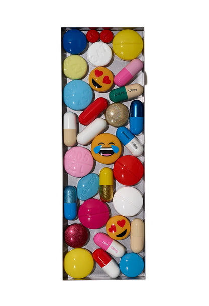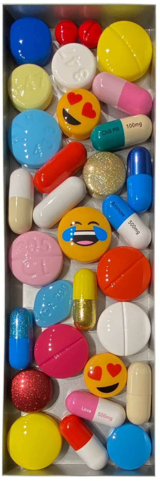Le opere di Coady sono pillole tridimensionali incastonate e incorniciate. Queste capsule, lucide, glitterate, seducenti come caramelle, sono l’incarnazione plastica di un tema centrale nella cultura contemporanea: il fragile equilibrio tra cura e illusione, tra bisogno autentico e dipendenza emotiva.