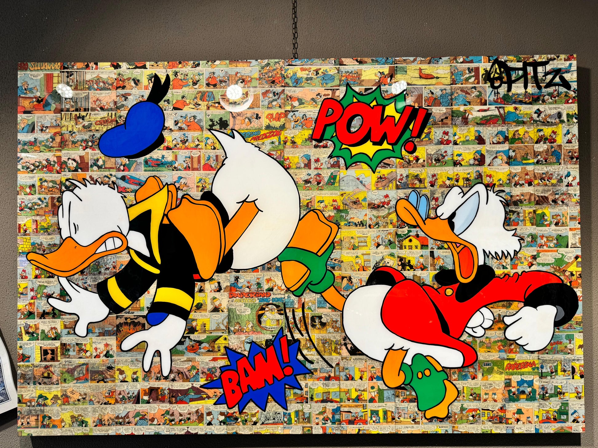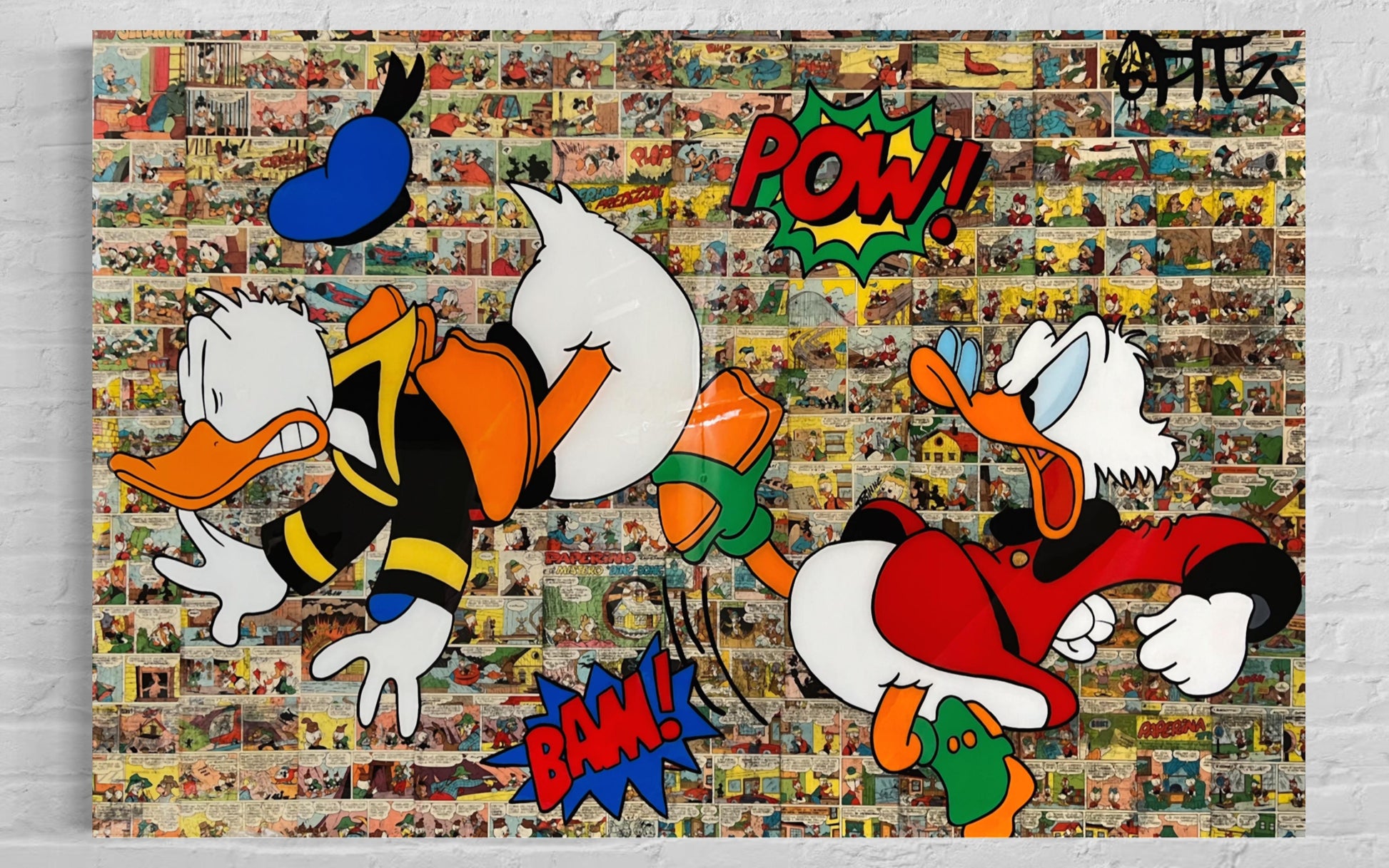 Nell'immagine, vediamo Zio Paperone che dà un calcio nel sedere a Paperino, un atto che simboleggia la loro relazione tumultuosa. L'opera è realizzata con colori acrilici e include elementi caratteristici dei fumetti, come le nuvolette con onomatopee che rappresentano il rumore del calcio. Lo sfondo è composto da veri fumetti.