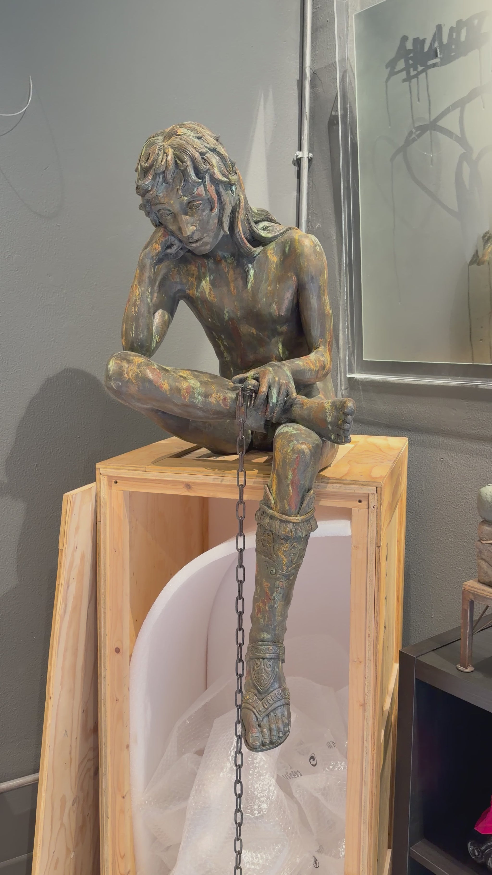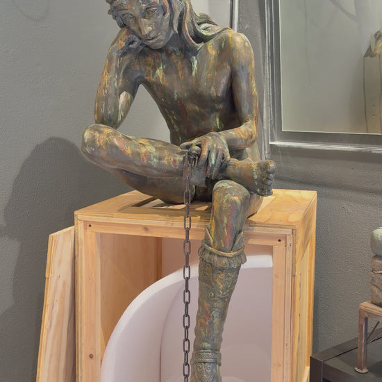 I soggetti che scelgo sono archetipi, immagini simboliche che risuonano in noi ognuna in un determinato modo. È importante partire da ciò che abbiamo attorno, da ciò che costituisce la nostra cultura col fine di interiorizzarla, filtrarla e quindi superarla. Nel citazionismo c’è un sentimento di riconoscenza verso ciò che nella storia è stato considerato Bello. Nei miei lavori queste icone vengono però in qualche modo maltrattate, celate, costrette, sacrificate. È questo l’aspetto che scaturisce dal contemporaneo, dalle percezioni del presente. L’atto simbolico di “rapire” opere iconiche del passato risulta dissacrante. Può rappresentare il bisogno di liberarsi da un’educazione, da una tradizione che in certi casi può essere tarpante, bloccarci in preconcetti e canoni. Allo stesso tempo è un modo per dare nuova vita, rendere più vicini a noi, più umani, dei simboli considerati intoccabili, inestimabili. La chiave di lettura della mia ultima serie di lavori è, non tanto nel soggetto centrale (che si riduce ad archetipo), quanto nella sua “cornice”, il contenitore. Le sculture vengono rinchiuse ed esposte nei loro contenitori da trasporto, casse o gabbie in legno che sono allo stesso tempo prigione e protezione. Le casse, le gabbie da trasporto, gli imballaggi fanno dell’opera una merce. Qualcosa che verrà spedita, trasportata, venduta e magari rivenduta e ritrasportata ecc. Emergono dei controsensi: è davvero possibile che Arte sia anche merce? L’Arte non è tale in quanto libera? è possibile che la vera Arte nasca da compromessi? L’obiettivo principale, la Necessità, è raggiungere con la maggiore immediatezza possibile la tangibilità fisica dell’immagine che più corrisponde all’idea. Per questo prediligo come elemento di partenza la terra, la creta. Da qualcosa di così basilare, di così scontato come la terra si ha la sensazione di poter dare vita a qualsiasi forma. Ci si sente come una sorta di piccolo demiurgo. Dopo la fase di modellato, quando l’idea incomincia a prende consistenza, è compito dello scultore trovare la soluzione migliore, il compromesso più efficace tra idea originaria, resa tattile, composizione nell’ambiente e fattibilità pratica. Solitamente mi affido alle tecniche di formatura per definire in materiali duraturi come resine, cemento, bronzo o ceramica. Ma ciò che è fondamentale è il Gesto. Prima di tutto per chi lo pratica… è terapeutico. In una società sclerotizzata come la nostra in cui siamo portati a un’iperattività nella mente e nel virtuale, spesso dimentichiamo di dare sfogo a quella parte fondamentale di noi, quella legata al sensoriale con la quale creiamo un legame, una connessione con la realtà. E quindi con gli Altri.