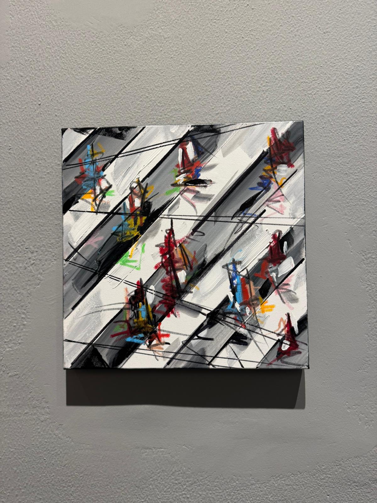 I colpi di colori vivaci stesi dall'artista attenuano l'irrequietezza delle tonalità sfumate di bianco, grigio e antracite, tipiche dell'asfalto. Individui alienati attraversano frettolosamente strisce pedonali, trasportando borse durante una giornata di shopping. In effetti, l'unico svago che la vita metropolitana spesso offre è l'acquisto sfrenato, lo shopping compulsivo. Tuttavia, l'imperativo rimane la fretta: shopping sì, ma veloce. Magari durante la pausa pranzo.