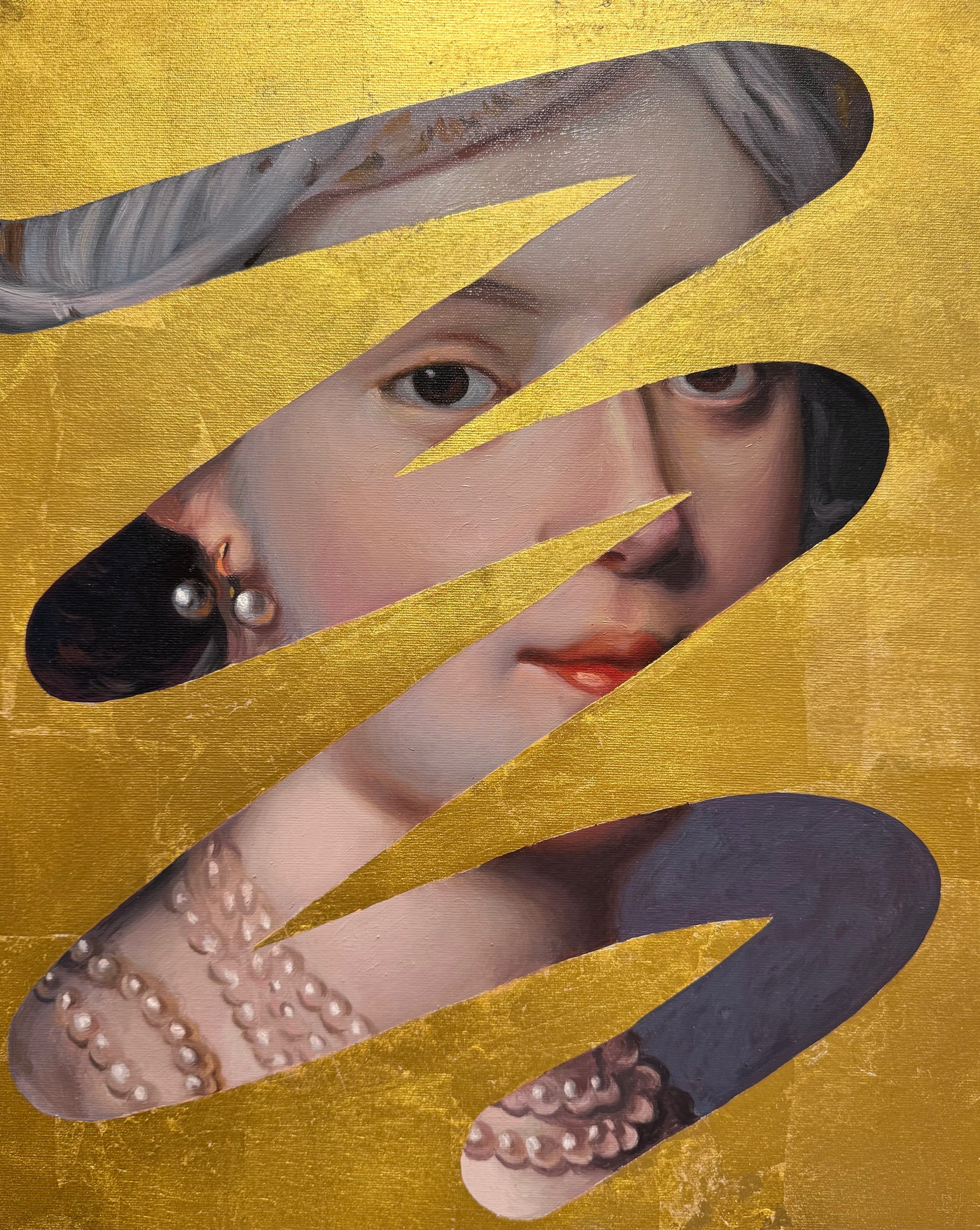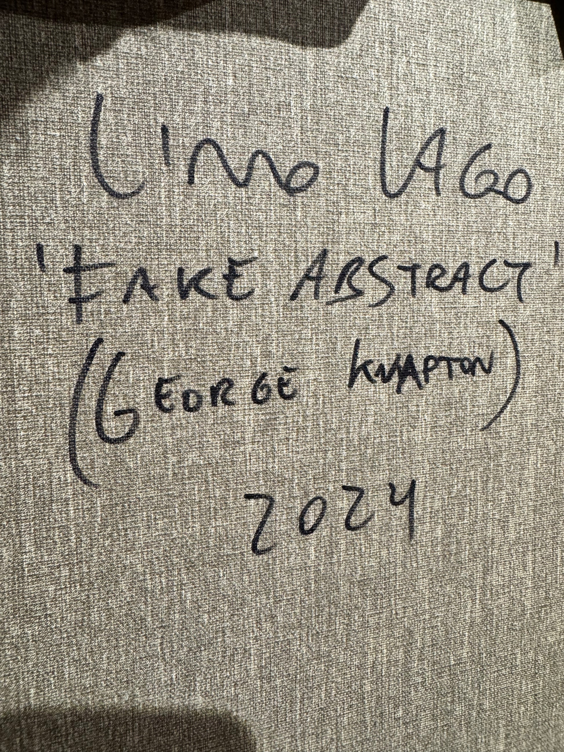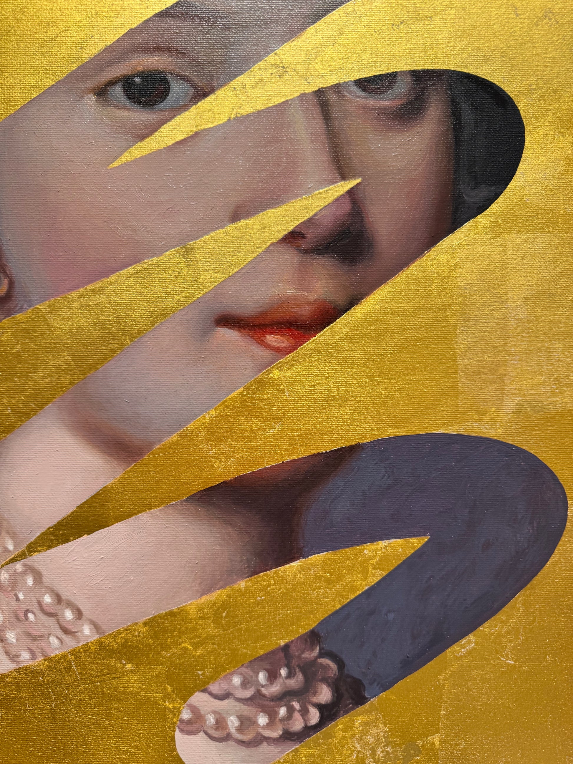 Lino Lago riproduce un'opera di George Knapton, ritrattista inglese attivo nel 1700 a Londra. Il volto zommato della fanciulla viene ricoperto da uno strato di foglia oro. Uno scorcio sulla tela rivela il volto nascosto dalla colata dorata. Anche questo Fake Abstract unisce due tendenze opposte: arte astratta e figurativa. Per Lago non esiste una supremazia tra i due stile pittorici. Fake Abstract è la convivenza dell'antitetico.