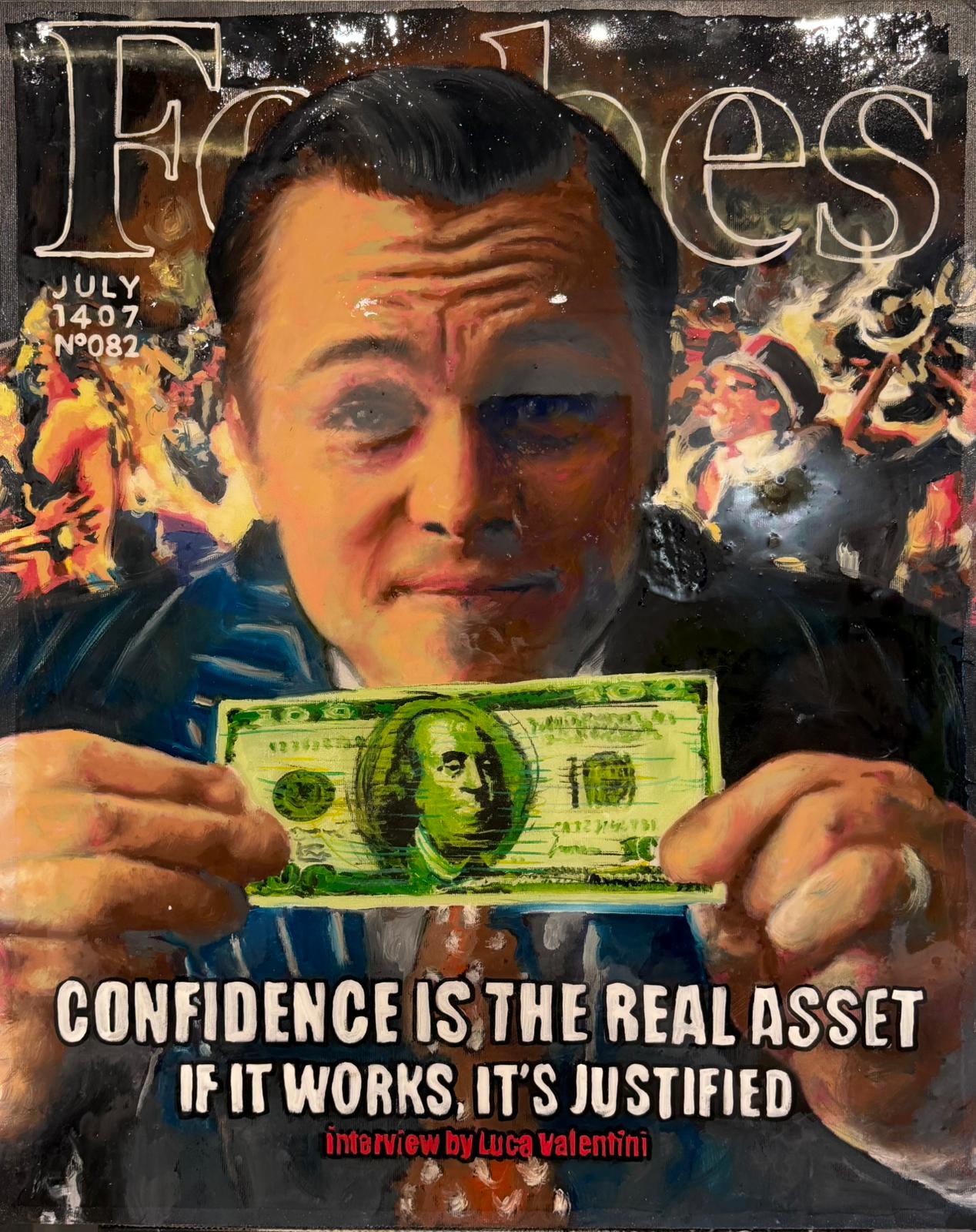 L'opera realizzata da Valentini, rappresenta Leonardo DiCaprio con un dollaro in mano, quasi fosse una divinità contemporanea, non nel senso religioso tradizionale ma come simbolo del nuovo culto dei nostri giorni: quello della sicurezza personale, del successo individuale e della fiducia in se stessi come unico vero valore. La frase confidence is the real asset, if it works it’s justified riassume perfettamente questa mentalità, perché racconta un mondo in cui non conta più se qualcosa è giusto o sbagliato, ma solo se funziona. L’etica passa in secondo piano rispetto al risultato, e l’interesse personale diventa più importante del bene collettivo, del contesto, di ciò che ci circonda. Il personaggio guarda lo spettatore con un’espressione ambigua, a metà tra l’autocelebrazione e la consapevolezza di far parte di un sistema che premia chi crede in se stesso senza porsi troppe domande. Il dollaro diventa un oggetto sacro, un’icona, perché oggi la fiducia non è più riposta nei valori condivisi, ma nella capacità del singolo di imporsi, di vincere, di emergere. È un’immagine che parla di un’epoca in cui il successo giustifica tutto, in cui il singolo è più importante del complessivo, e in cui la morale viene spesso sacrificata in nome dell’efficacia, dell’ambizione e della performance personale.