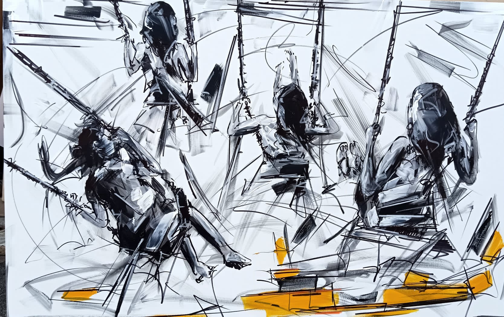 I segni pittorici di quest'opera d'arte sono irrequieti, come gli umani che vivono i ritmi della nostra società. Corpi fatti di strappi, linee isteriche e segni nevrotici che esprimono la schizofrenia della nostra contemporaneità.