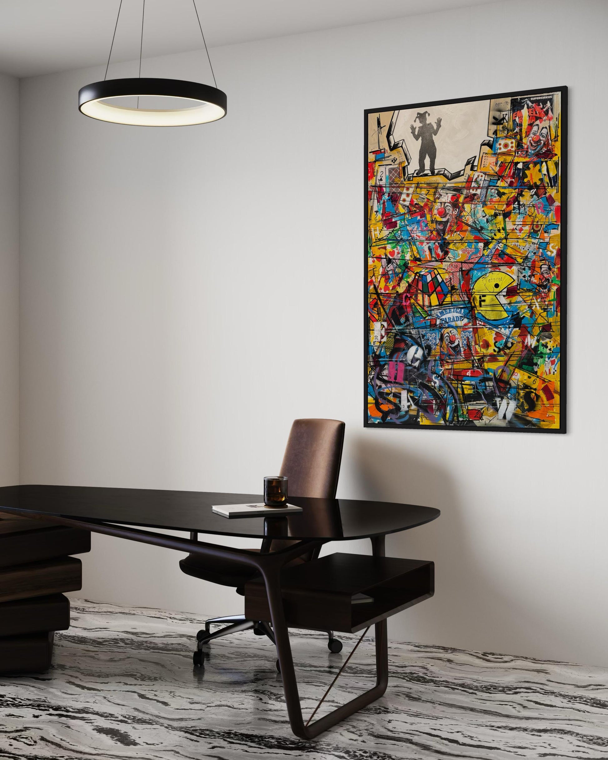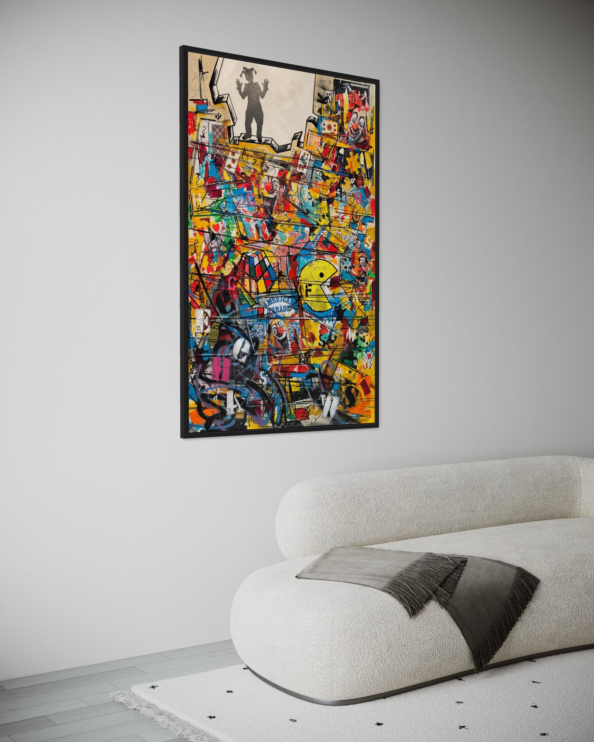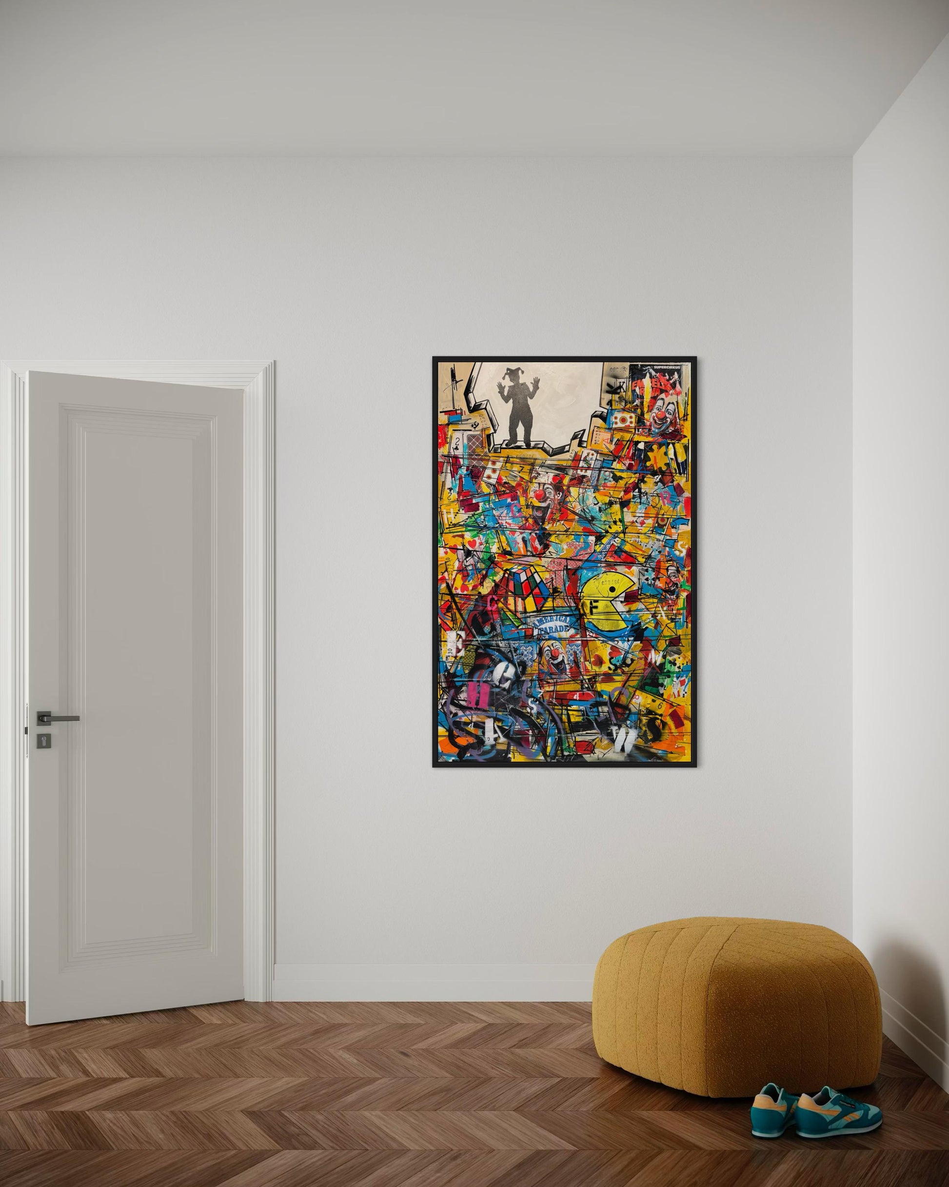 Marco Tamburro rappresenta la geografia urbana. L'artista perugino erige una barriera di confine: una muraglia che è un caotico cimitero di immagini colorate, simboli e oggetti della nostra cultura. Un muro che accumula graffiti, cartelloni pubblicitari e locandine cinematografiche vintage. I residui logori e sbiaiditi del passato vengono coperti con nuove pubblicità accattivanti. Questi manifesti sovrapposti sono tracce della nostra cultura.