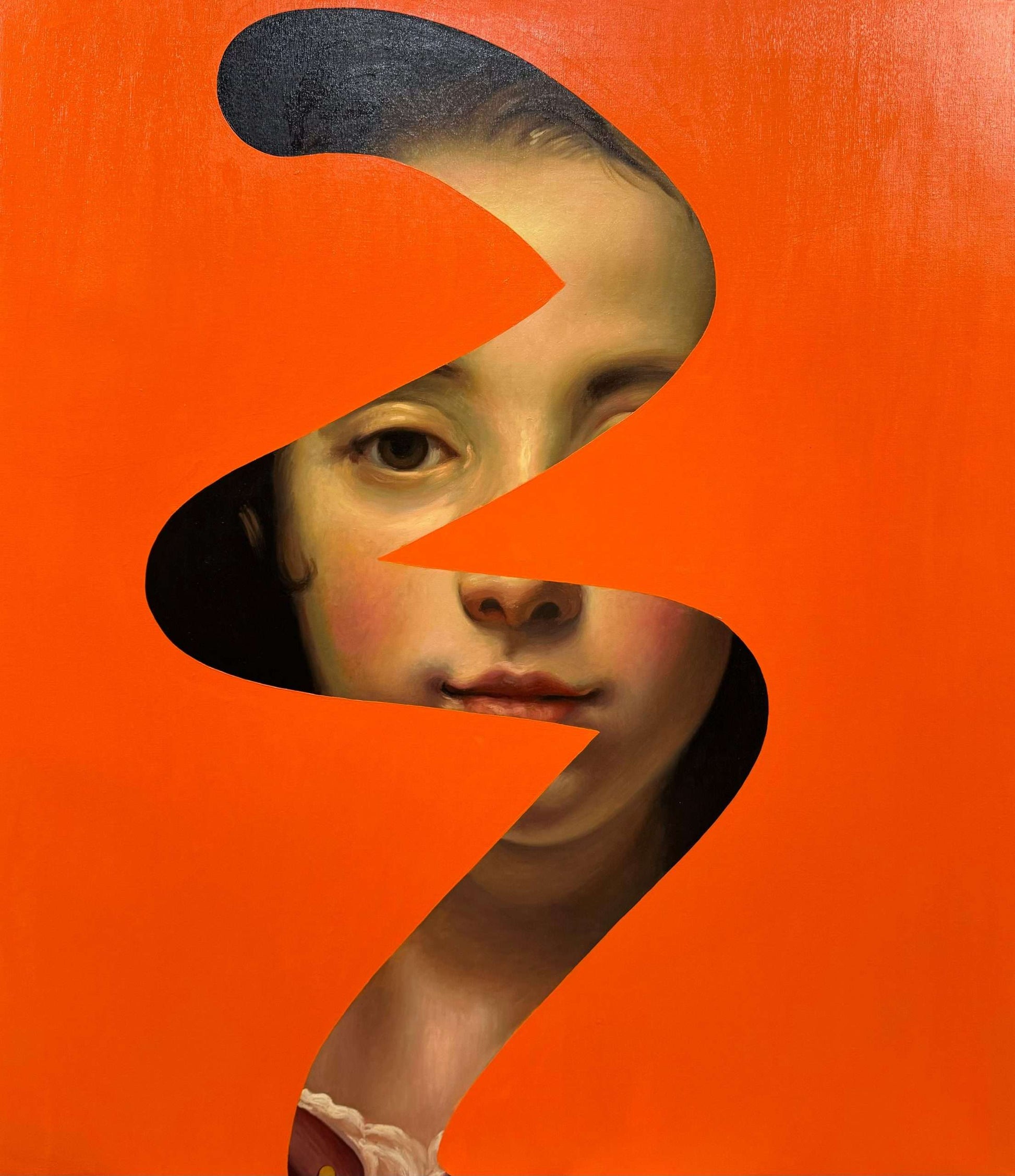 La ricerca del contrasto continua: arte astratta e figurativa convivono nella stessa opera. Per Lino Lago, la convivenza è possibile e le sue opere lo dimostrano. L’artista spagnolo riproduce “Head of a young girl”, opera del pittore fiammingo Jacob Van Oost. Il volto della giovane fanciulla, come di consueto, è coperto da uno strato monocolore arancione. Una striscia curvilinea svela parzialmente il volto della fanciulla. La fusione tra astratto e figurativo crea una coesione che annulla la rivalità; non c’è supremazia tra i due stili pittorici. Il contrasto tra forze opposte chiede tregua. Il concetto dei Fake Abstract è democratico: non esiste uno stile pittorico migliore rispetto a un altro. Lino Lago trasmette un potente messaggio di convivenza e pace.