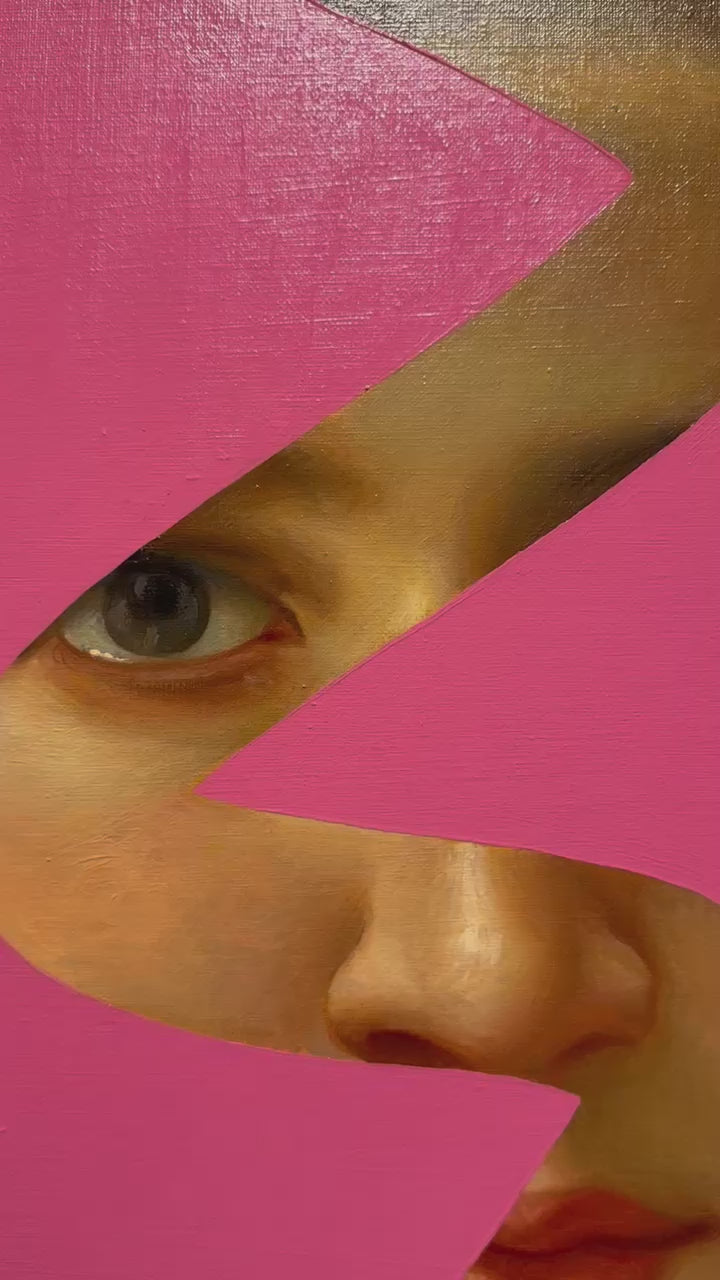 La tela eseguita da Lago riproduce il volto della protagonista del quadro “The broken pitcher” realizzato da Bouguereau nel 1891. L’opera originale rappresenta una ragazza che ha perso la verginità. Lago fa uno zoom al volto della fanciulla e lo copre con una mano di rosa. La solita fenditura nello strato monocromo mostra il volto della fanciulla. Grazie alla fessura realizzata da Lago, intravediamo il viso della ragazza. Il suo sguardo comunica qualcosa. La mesta espressione della contadina rappresenta la perdita dell’innocenza. Un altro capolavoro viene dissacrato da Lago. L’artista spagnolo crea un’opera d’arte dal significato apparentemente illogico. Il disorientamento è studiato per innescare il pensiero nel fruitore. L’antitetica unione attiva le nostre sinapsi. Una riflessione sul lungo e complesso dibattito tra arte figurativa e arte astratta è l’obiettivo di Lago.