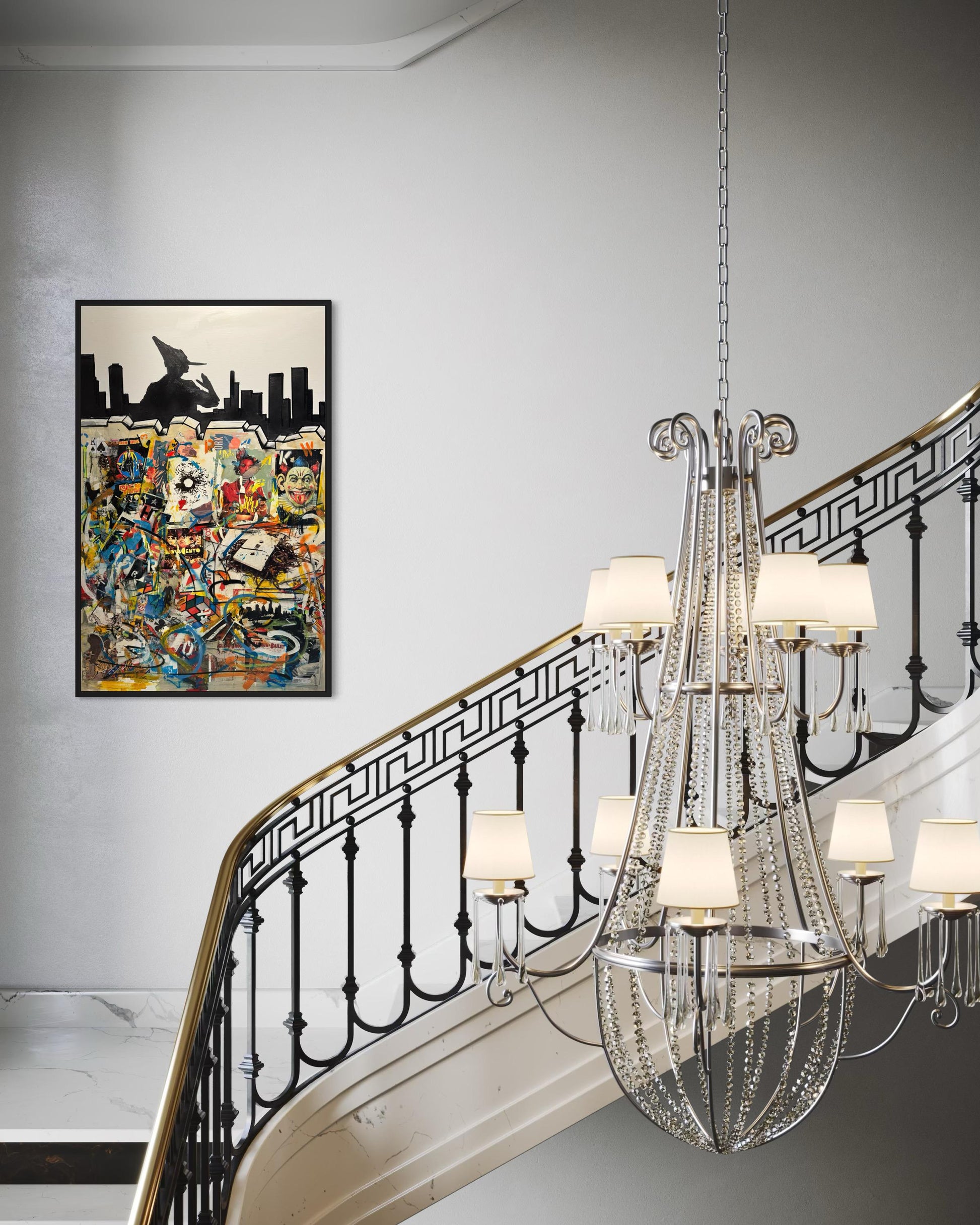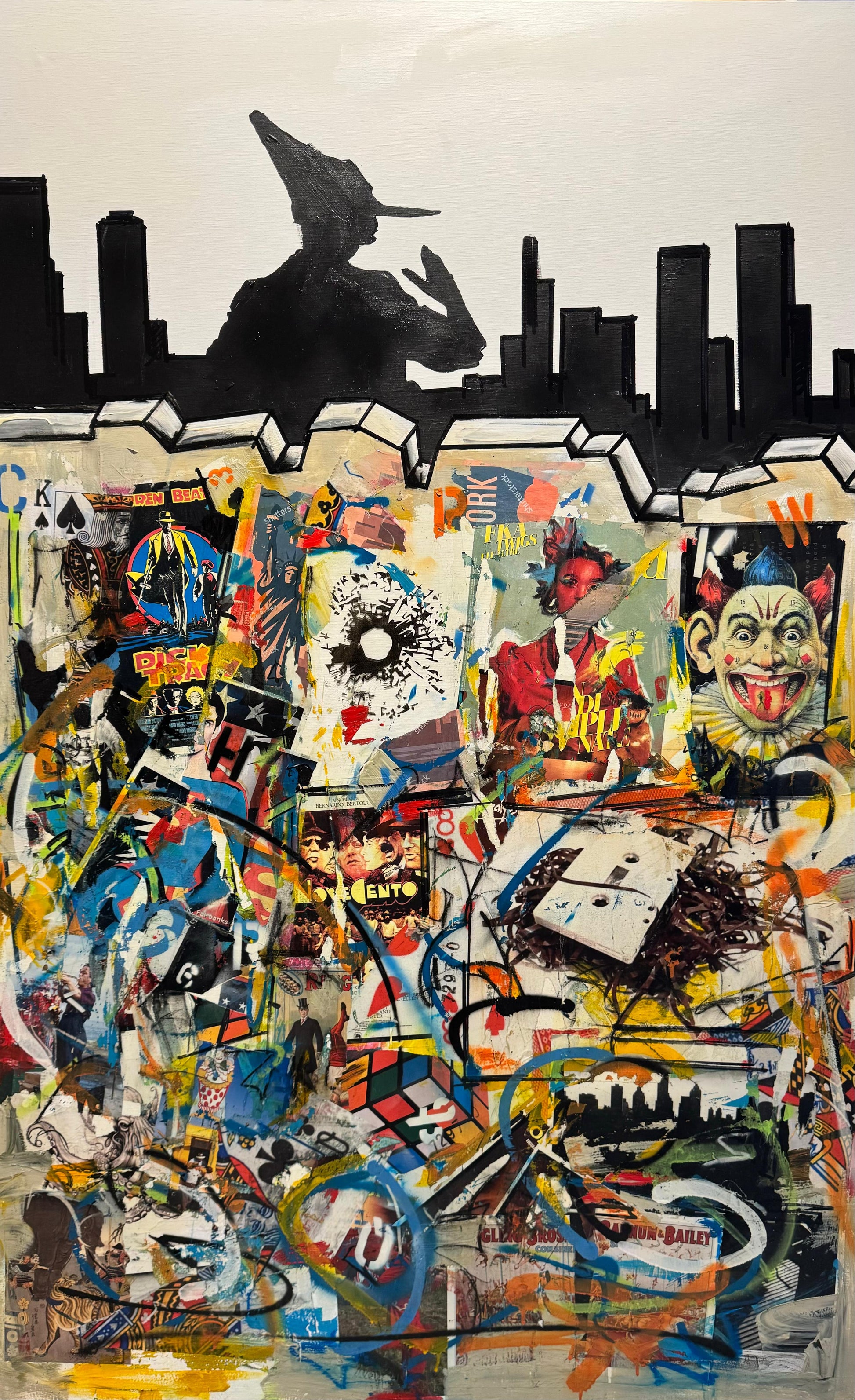 Sopra il muro fratturato notiamo delle figure in ombra: un giullare, Pinocchio, una donna e figure umane indefinite. Solo loro possono svelare il mistero: cosa si nasconde oltre? Forse un mondo lontano dalle logiche e dai meccanismi della nostra società capitalistica. Una nuova città-Eden dove regna la felicità.