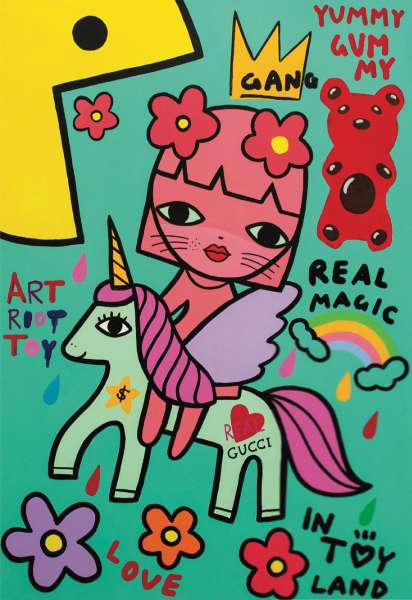 Amanda Toy, (Genova, 1976), è un’artista che racconta la realtà con la gioia e la leggerezza dei bambini, riempiendo il mondo, e le sue tele, di colori vivaci e vibranti. La sua arte è una fonte di ispirazione per chiunque voglia (ri)scoprire il proprio lato giocoso e un po’ disubbidiente. Nei suoi quadri, e nei suoi tatuaggi, visto che oltre a essere artista è anche una famosa tatuatrice, Amanda Toy dà vita a un universo immaginario giocosamente pop, o anar-chic, popolato da storie intrise di emozioni e sentimenti raccontate attraverso linee decise e colori vividi. Questo mondo rosa e ottimista è abilmente mixato a uno spirito pop, e contemporaneo, che esplode in un iconico e ironico omaggio al denaro e al lusso. La sua arte è evoluta con la sua carriera di tatuatrice che l’ha portata prima da Genova a Trieste e da lì negli Stati Uniti, in Giappone e in giro per l’Europa. Superare i confini e ampliare gli orizzonti ha reso il suo stile ancora più eclettico e internazionale con i quadri che, poco a poco, si sono popolati di soggetti, forme e colori mutate dal mondo del toy. Per dieci anni si divide tra l’Italia e Londra dove tatua per una settimana al mese clienti provenienti da ogni angolo del globo. Sia i quadri che i tattoo sono dominati da bamboline spensierate, precise e definite sulla pelle, più intime e materiche nelle versioni su tela. Nel 2012 Amanda Toy approda a Milano dove inaugura il Toy Tattoo Parlour, studio di tatuaggi caratterizzato da un ambiente in sintonia con la sua creatività e da liste d’attesa lunghe un anno. Parallelamente al progredire della sua carriera di tatuatrice, intuisce che i suoi disegni possono essere replicati su qualsiasi supporto. Lancia così le collezioni di borse, cuscini e oggetti di arredo diventando, di fatto, un brand di lifestyle. Con la creazione dei gioielli in ottone e argento, i suoi personaggi escono dalla tela e acquisiscono un corpo e uno spessore. Manufatti concreti in grado di entrare in relazione, e in contatto, con chi li indossa.