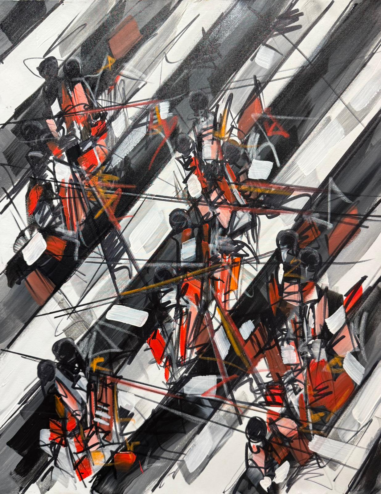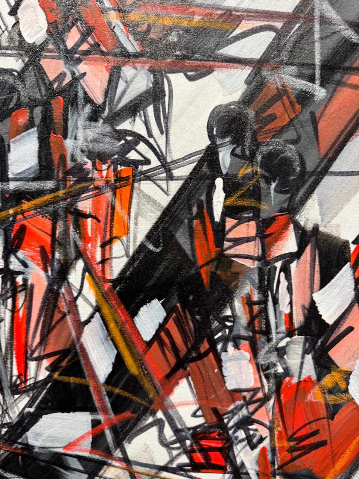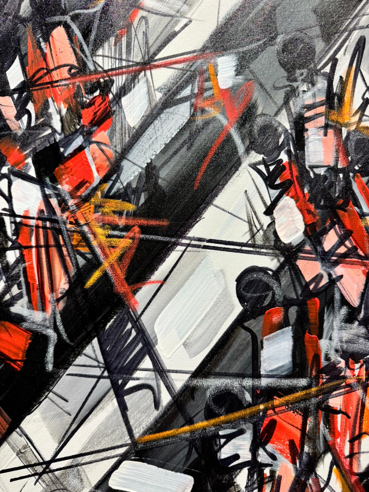 I colpi di colori vivaci stesi dall'artista attenuano l'irrequietezza delle tonalità sfumate di bianco, grigio e antracite, tipiche dell'asfalto. Individui alienati attraversano frettolosamente strisce pedonali, trasportando borse durante una giornata di shopping. In effetti, l'unico svago che la vita metropolitana spesso offre è l'acquisto sfrenato, lo shopping compulsivo. Tuttavia, l'imperativo rimane la fretta: shopping sì, ma veloce. Magari durante la pausa pranzo.