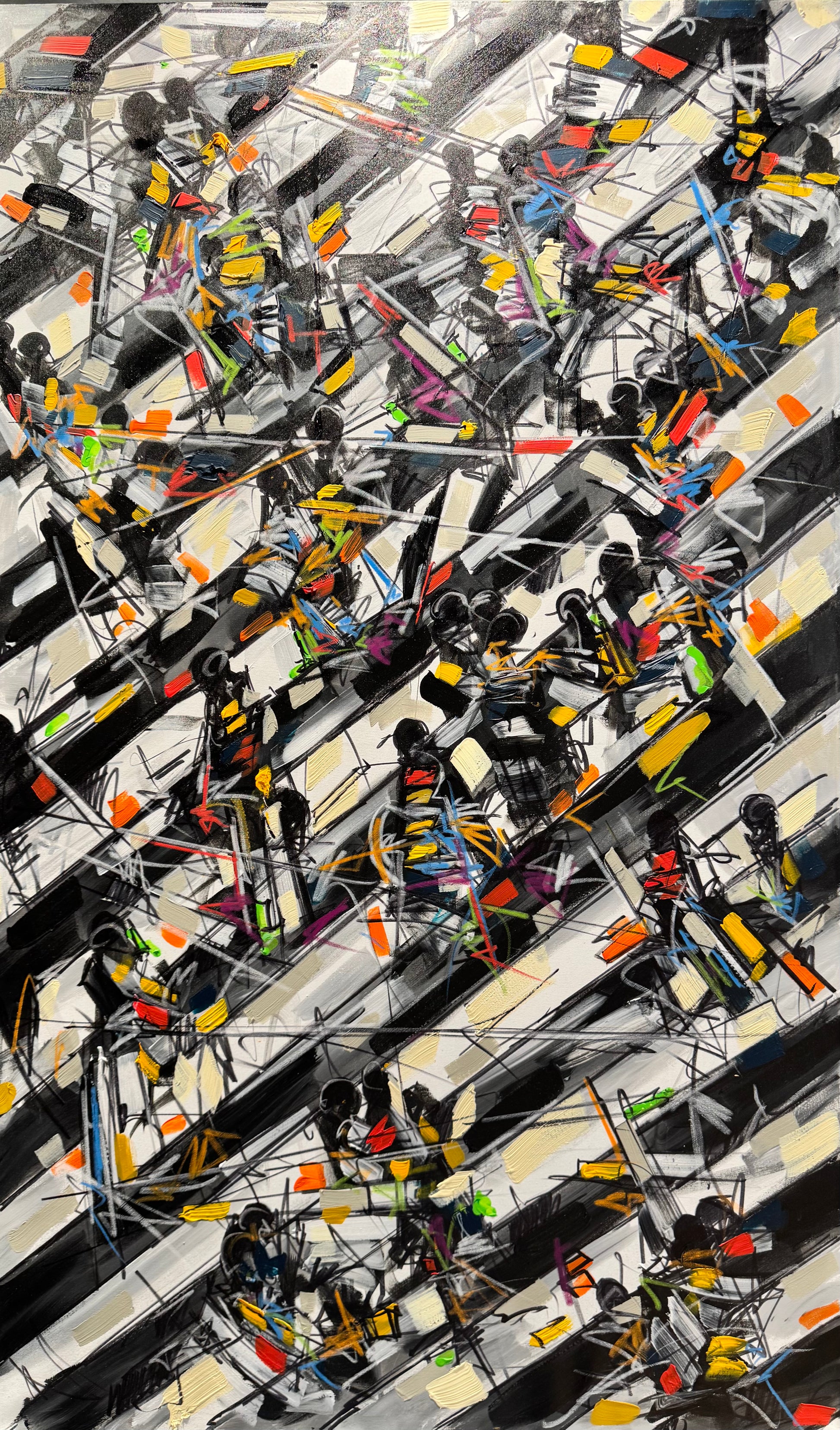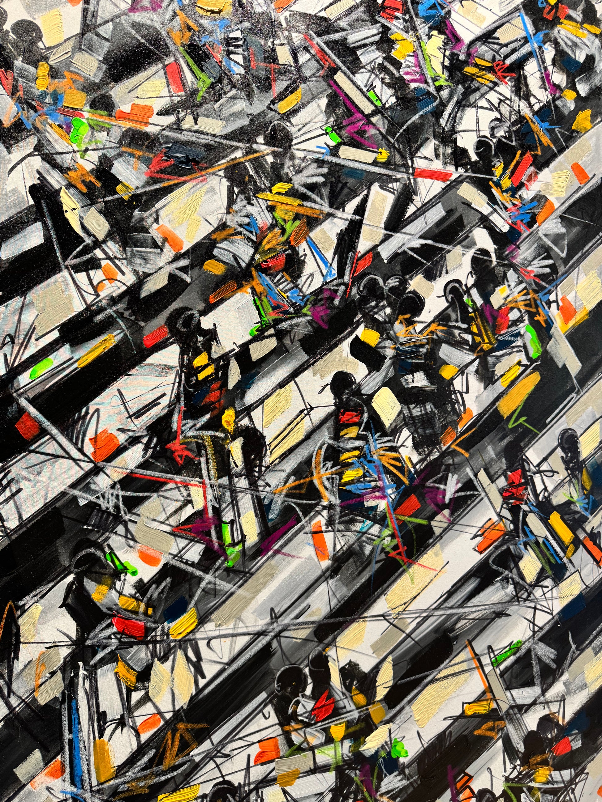 I colpi di colori vivaci stesi dall'artista attenuano l'irrequietezza delle tonalità sfumate di bianco, grigio e antracite, tipiche dell'asfalto. Individui alienati attraversano frettolosamente strisce pedonali, trasportando borse durante una giornata di shopping. In effetti, l'unico svago che la vita metropolitana spesso offre è l'acquisto sfrenato, lo shopping compulsivo. Tuttavia, l'imperativo rimane la fretta: shopping sì, ma veloce. Magari durante la pausa pranzo.