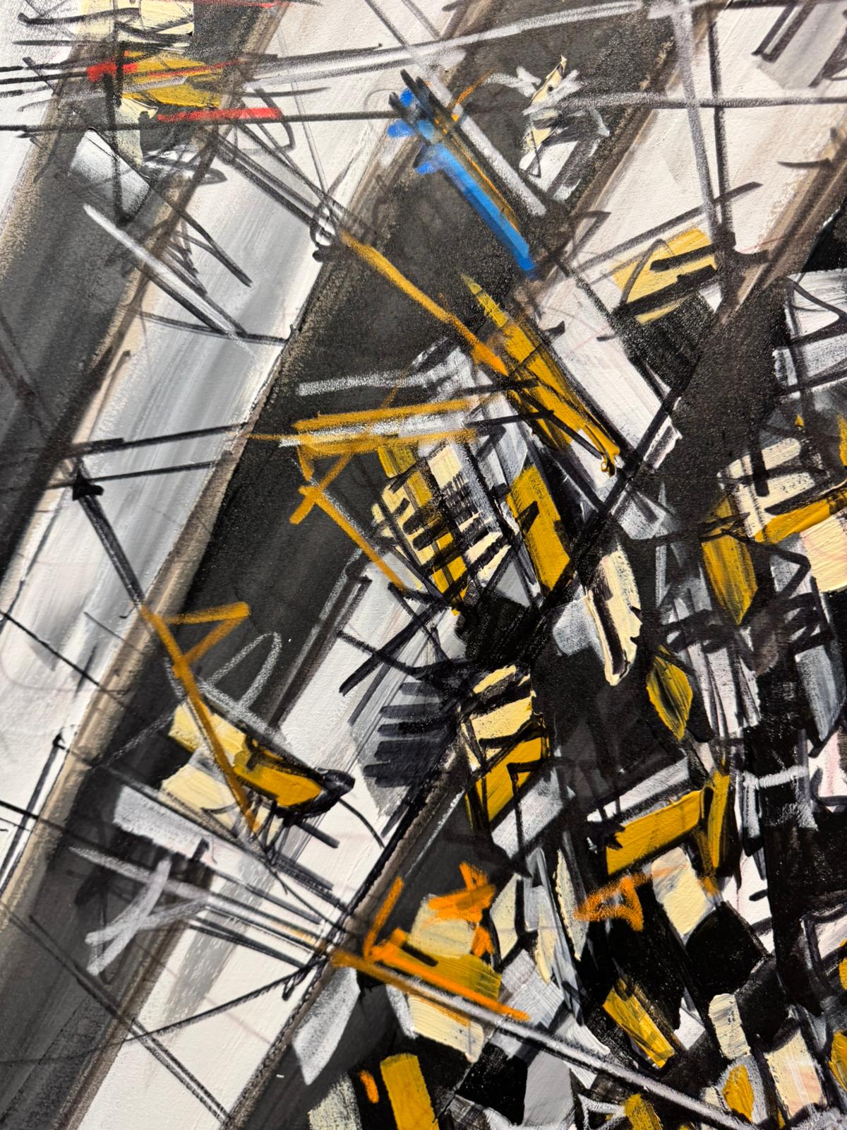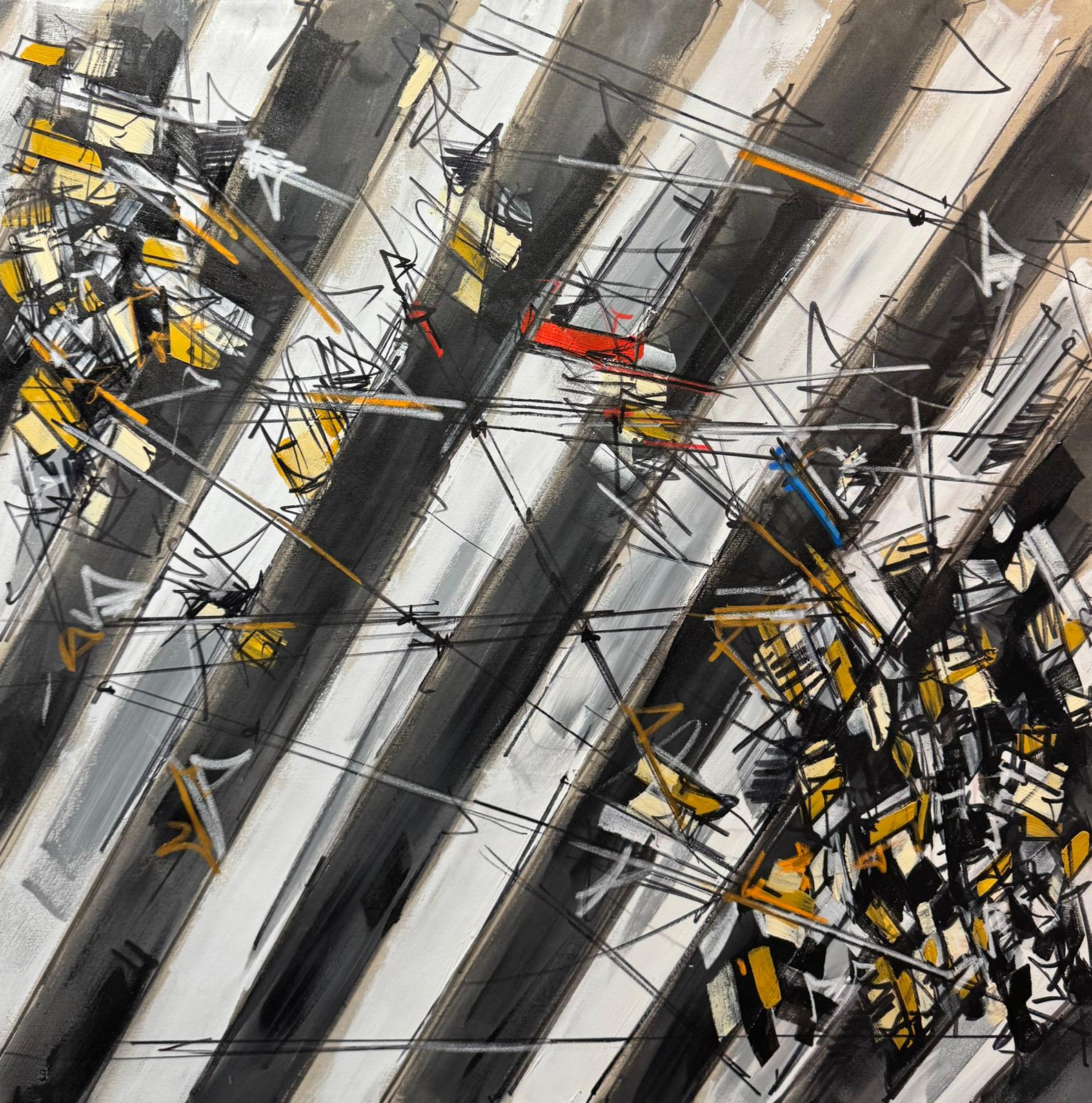 I colpi di colori vivaci stesi dall'artista attenuano l'irrequietezza delle tonalità sfumate di bianco, grigio e antracite, tipiche dell'asfalto. Individui alienati attraversano frettolosamente strisce pedonali, trasportando borse durante una giornata di shopping. In effetti, l'unico svago che la vita metropolitana spesso offre è l'acquisto sfrenato, lo shopping compulsivo. Tuttavia, l'imperativo rimane la fretta: shopping sì, ma veloce. Magari durante la pausa pranzo.