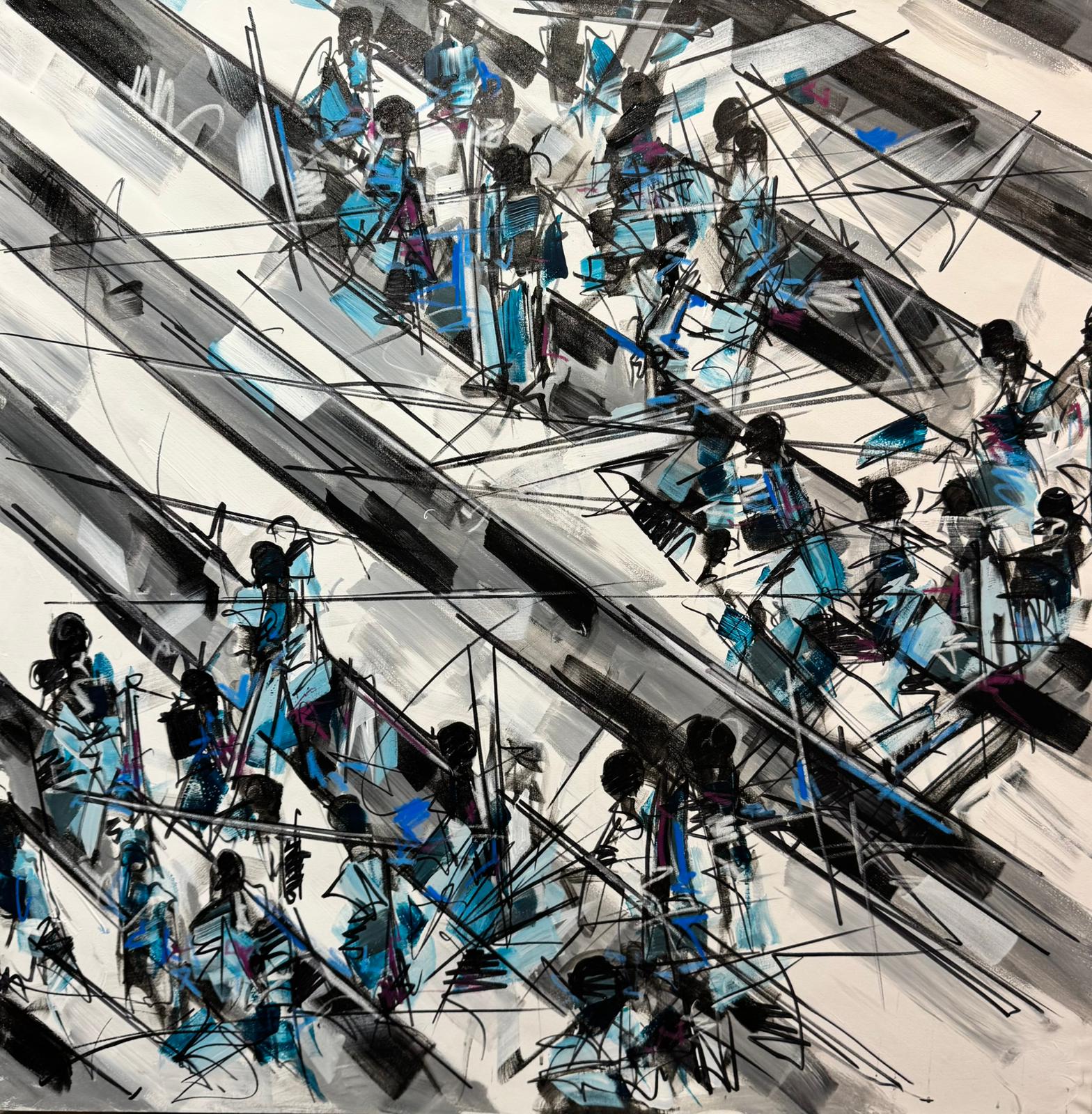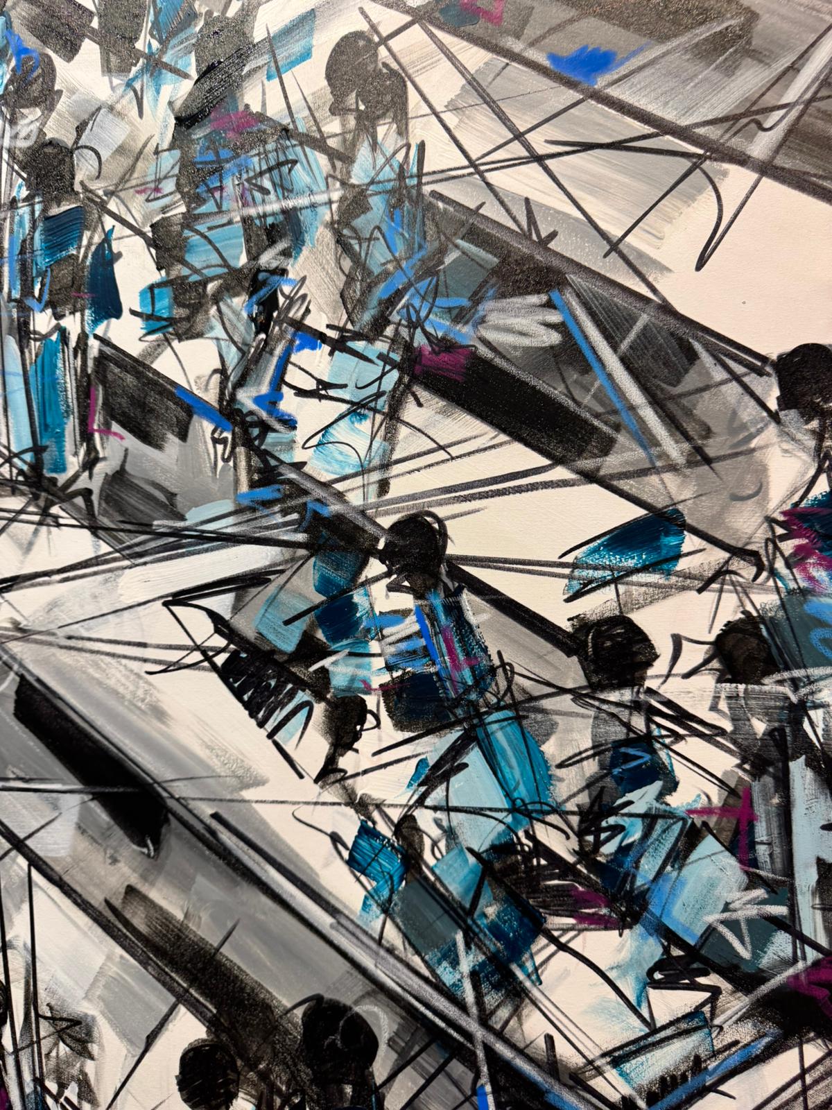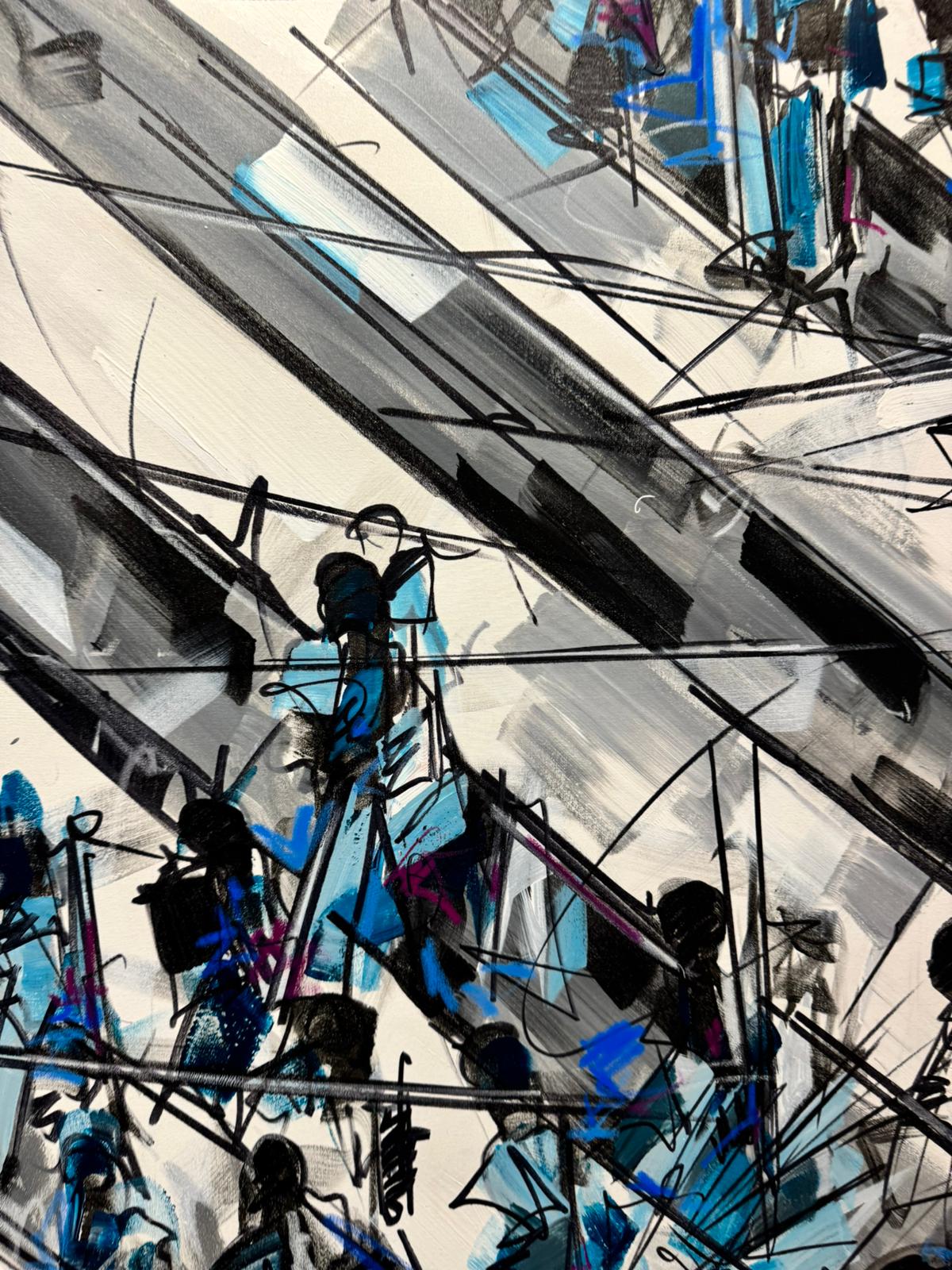 I colpi di colori vivaci stesi dall'artista attenuano l'irrequietezza delle tonalità sfumate di bianco, grigio e antracite, tipiche dell'asfalto. Individui alienati attraversano frettolosamente strisce pedonali, trasportando borse durante una giornata di shopping. In effetti, l'unico svago che la vita metropolitana spesso offre è l'acquisto sfrenato, lo shopping compulsivo. Tuttavia, l'imperativo rimane la fretta: shopping sì, ma veloce. Magari durante la pausa pranzo.