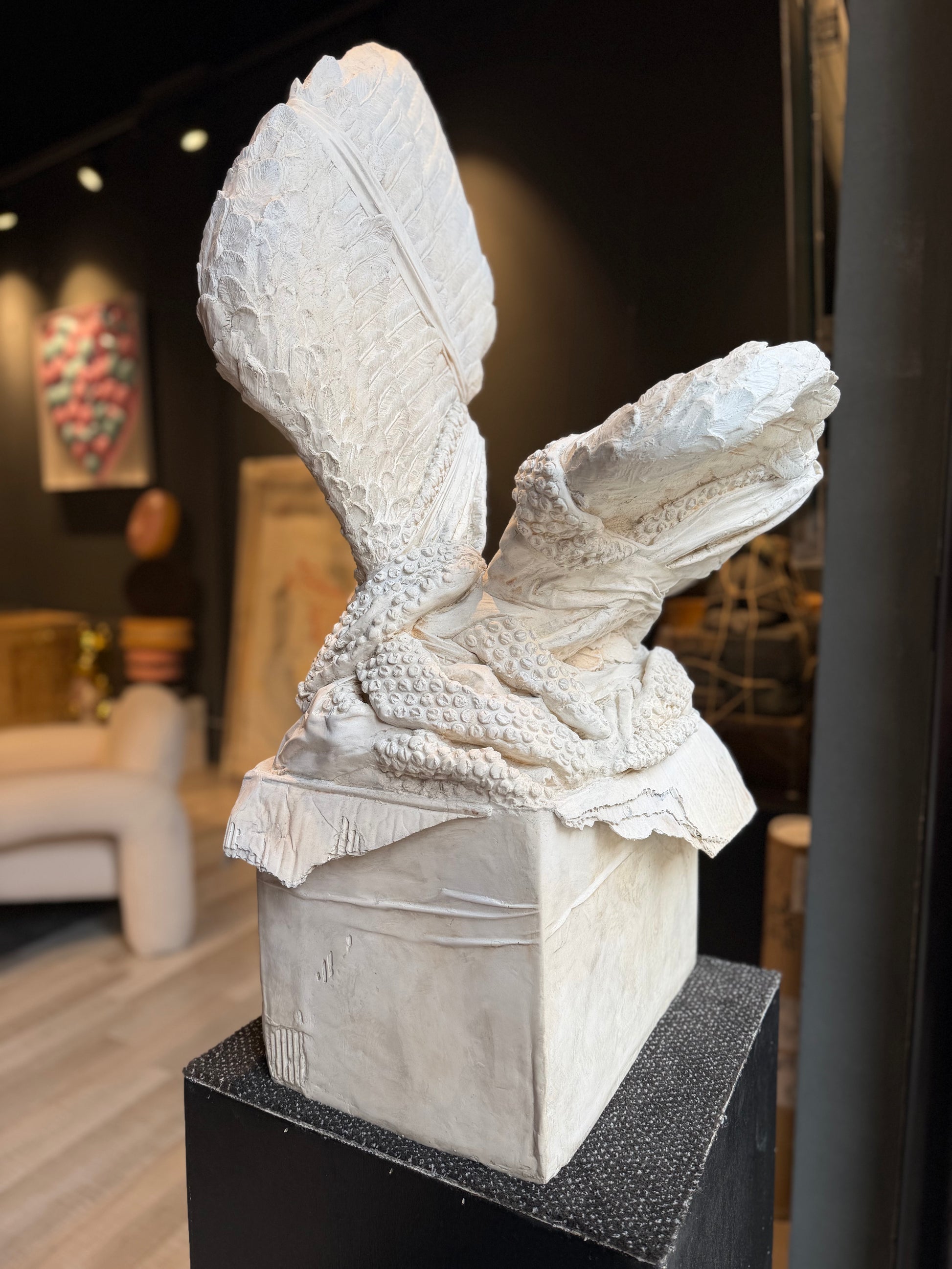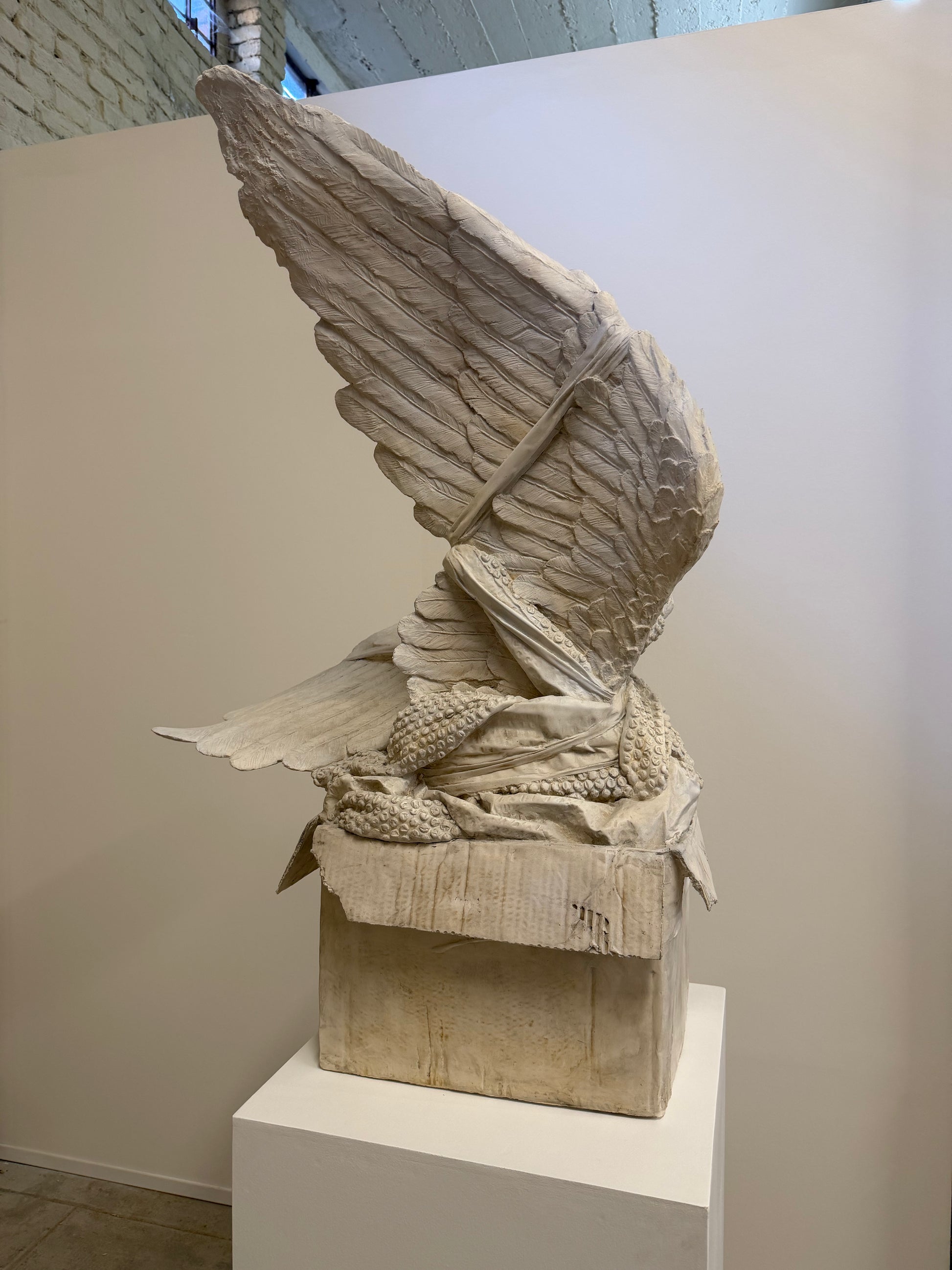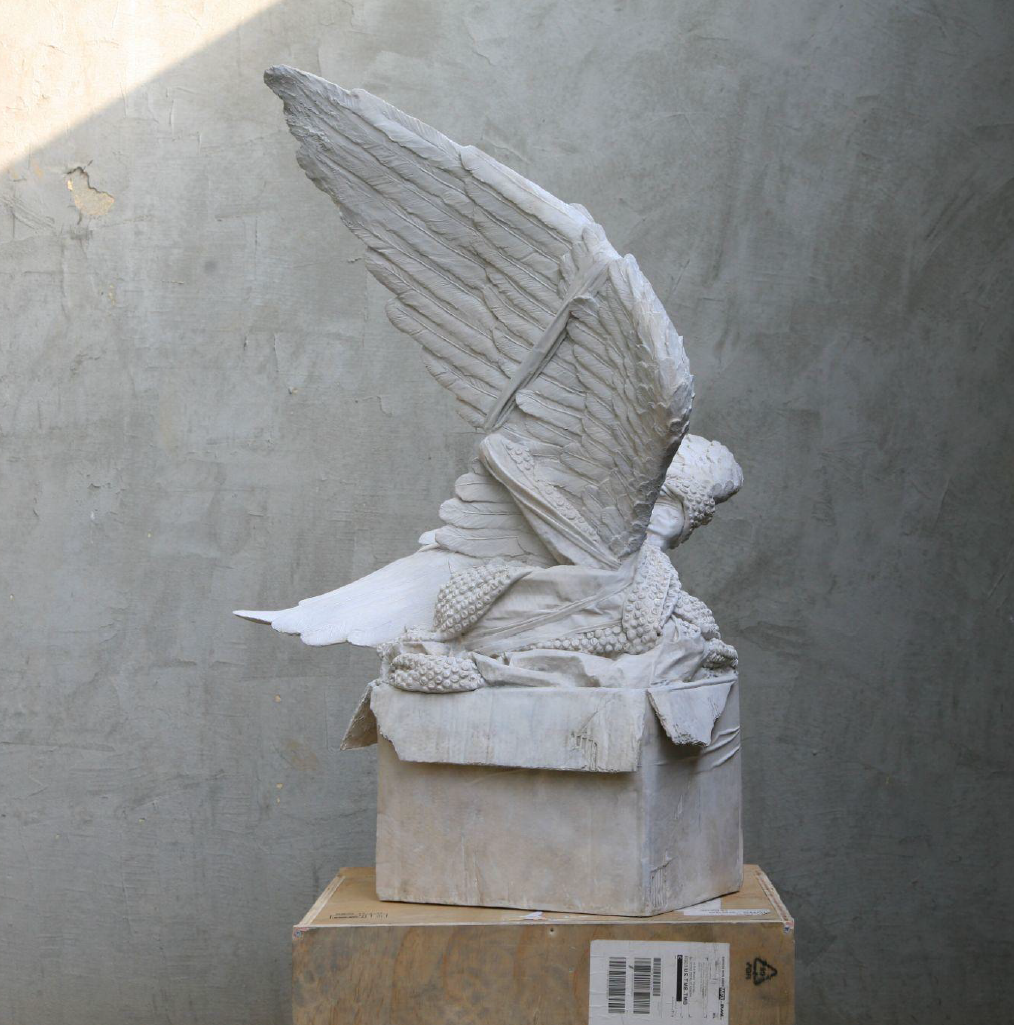 I soggetti che scelgo sono archetipi, immagini simboliche che risuonano in noi ognuna in un determinato modo. È importante partire da ciò che abbiamo attorno, da ciò che costituisce la nostra cultura col fine di interiorizzarla, filtrarla e quindi superarla. Nel citazionismo c’è un sentimento di riconoscenza verso ciò che nella storia è stato considerato Bello. Nei miei lavori queste icone vengono però in qualche modo maltrattate, celate, costrette, sacrificate. È questo l’aspetto che scaturisce dal contemporaneo, dalle percezioni del presente. L’atto simbolico di “rapire” opere iconiche del passato risulta dissacrante. Può rappresentare il bisogno di liberarsi da un’educazione, da una tradizione che in certi casi può essere tarpante, bloccarci in preconcetti e canoni. Allo stesso tempo è un modo per dare nuova vita, rendere più vicini a noi, più umani, dei simboli considerati intoccabili, inestimabili. La chiave di lettura della mia ultima serie di lavori è, non tanto nel soggetto centrale (che si riduce ad archetipo), quanto nella sua “cornice”, il contenitore. Le sculture vengono rinchiuse ed esposte nei loro contenitori da trasporto, casse o gabbie in legno che sono allo stesso tempo prigione e protezione. Le casse, le gabbie da trasporto, gli imballaggi fanno dell’opera una merce. Qualcosa che verrà spedita, trasportata, venduta e magari rivenduta e ritrasportata ecc. Emergono dei controsensi: è davvero possibile che Arte sia anche merce? L’Arte non è tale in quanto libera? è possibile che la vera Arte nasca da compromessi? L’obiettivo principale, la Necessità, è raggiungere con la maggiore immediatezza possibile la tangibilità fisica dell’immagine che più corrisponde all’idea. Per questo prediligo come elemento di partenza la terra, la creta. Da qualcosa di così basilare, di così scontato come la terra si ha la sensazione di poter dare vita a qualsiasi forma. Ci si sente come una sorta di piccolo demiurgo. Dopo la fase di modellato, quando l’idea incomincia a prende consistenza, è compito dello scultore trovare la soluzione migliore, il compromesso più efficace tra idea originaria, resa tattile, composizione nell’ambiente e fattibilità pratica. Solitamente mi affido alle tecniche di formatura per definire in materiali duraturi come resine, cemento, bronzo o ceramica. Ma ciò che è fondamentale è il Gesto. Prima di tutto per chi lo pratica… è terapeutico. In una società sclerotizzata come la nostra in cui siamo portati a un’iperattività nella mente e nel virtuale, spesso dimentichiamo di dare sfogo a quella parte fondamentale di noi, quella legata al sensoriale con la quale creiamo un legame, una connessione con la realtà. E quindi con gli Altri.